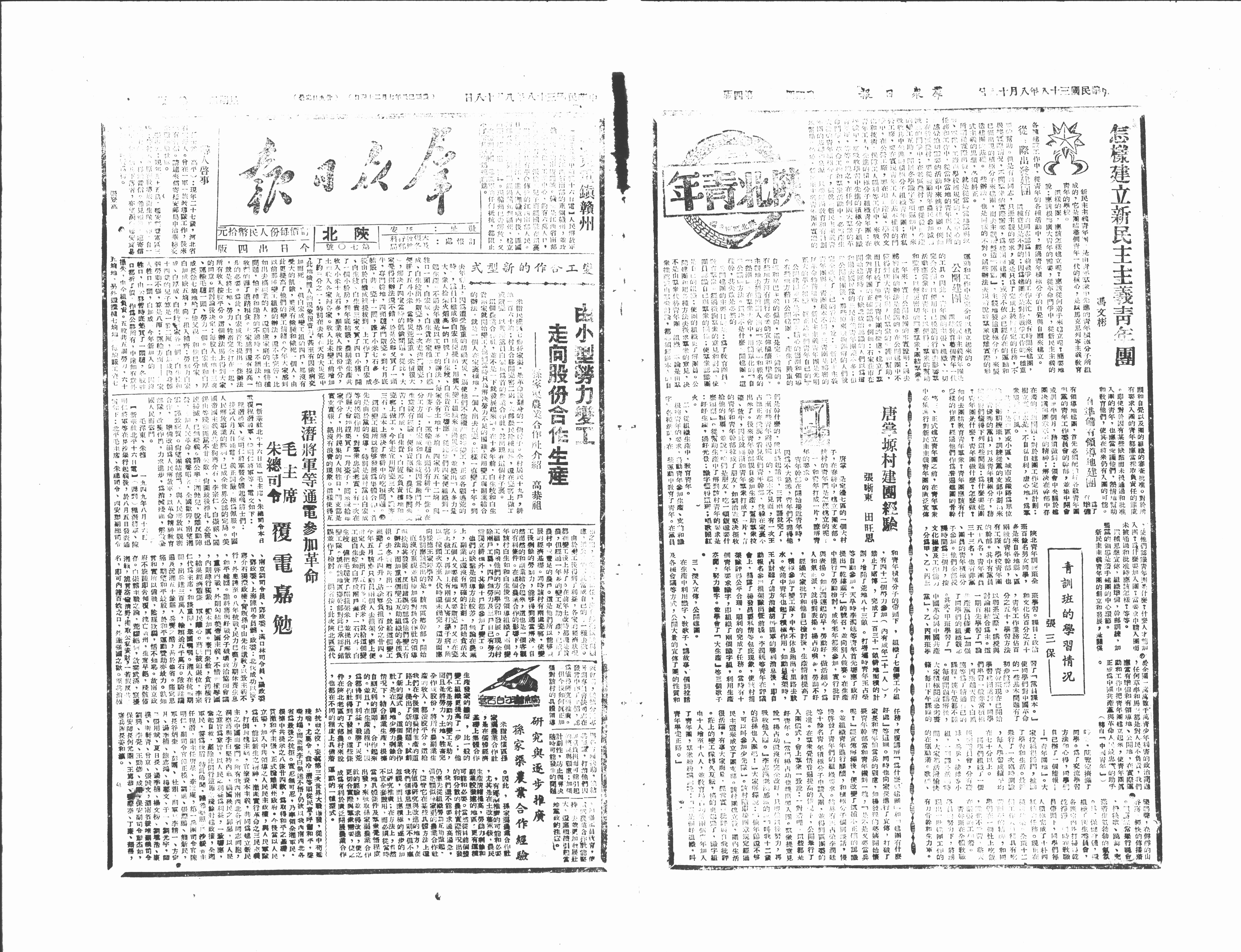 新民主主義青年團,是由青年群衆中先進的青年積極分子所組成的,它是團結整個青年一代的核心,是以馬克思列甯主義教育青年的學校。