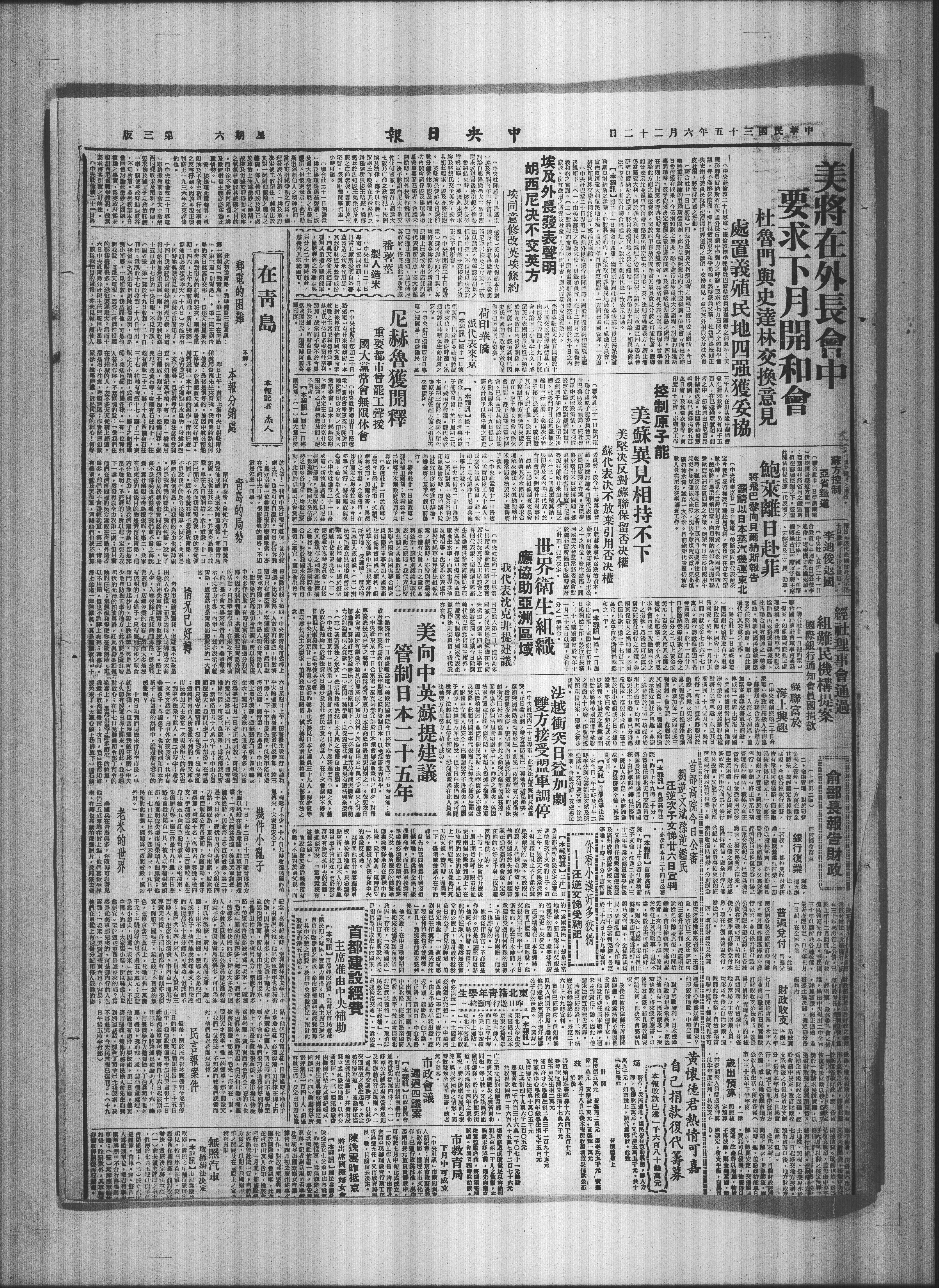 日已进入第二日,惟因甚多国家之代表包括苏联在内尚未抵逢,选举四主席事宜,遂遭延櫊。会议今日除选美代表巴兰为会议主席外,并派选八个联合国家代表组织程序法则委员会,我代表亦在内。