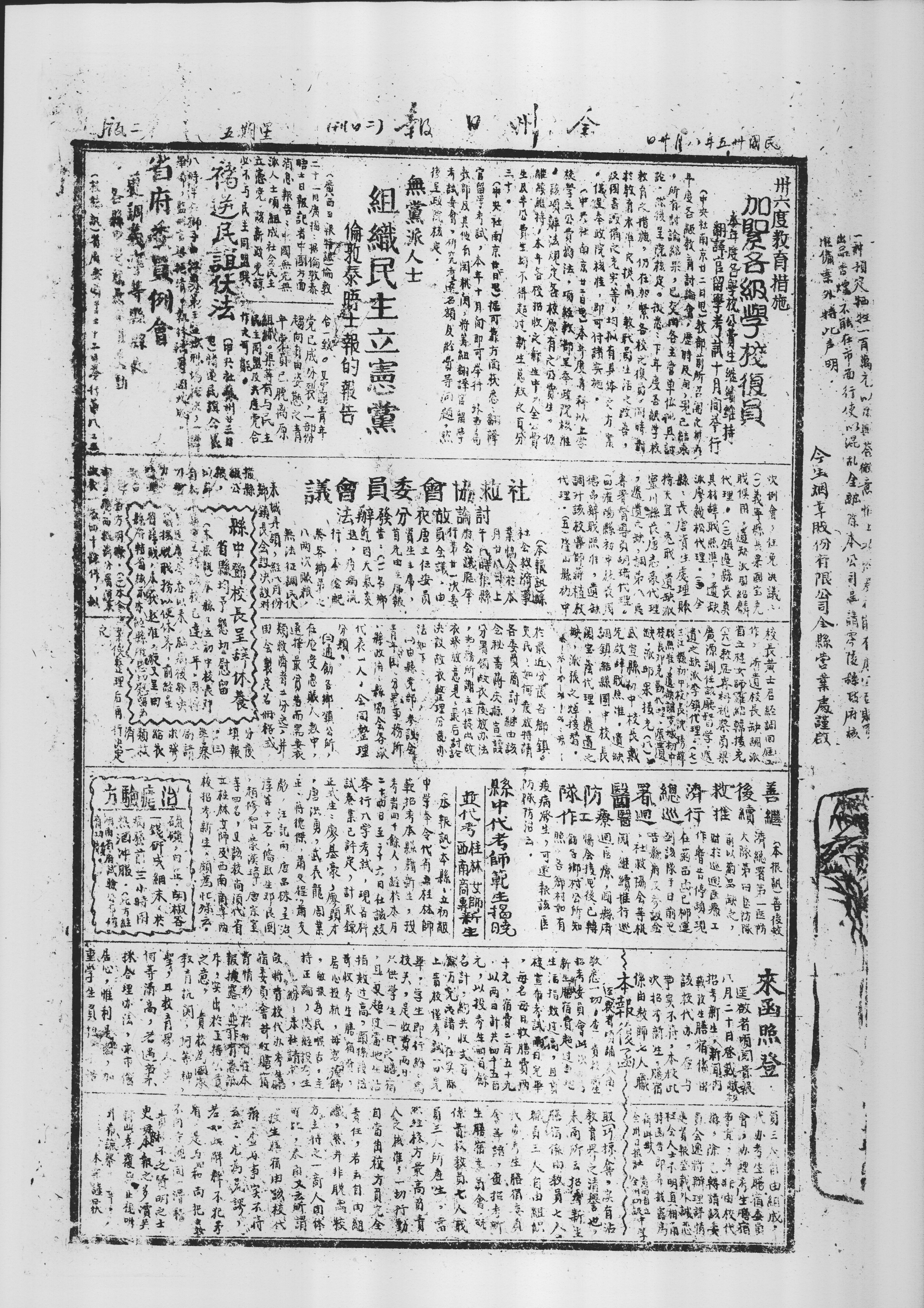 《中央社南京廿二日电)教部前所九树办