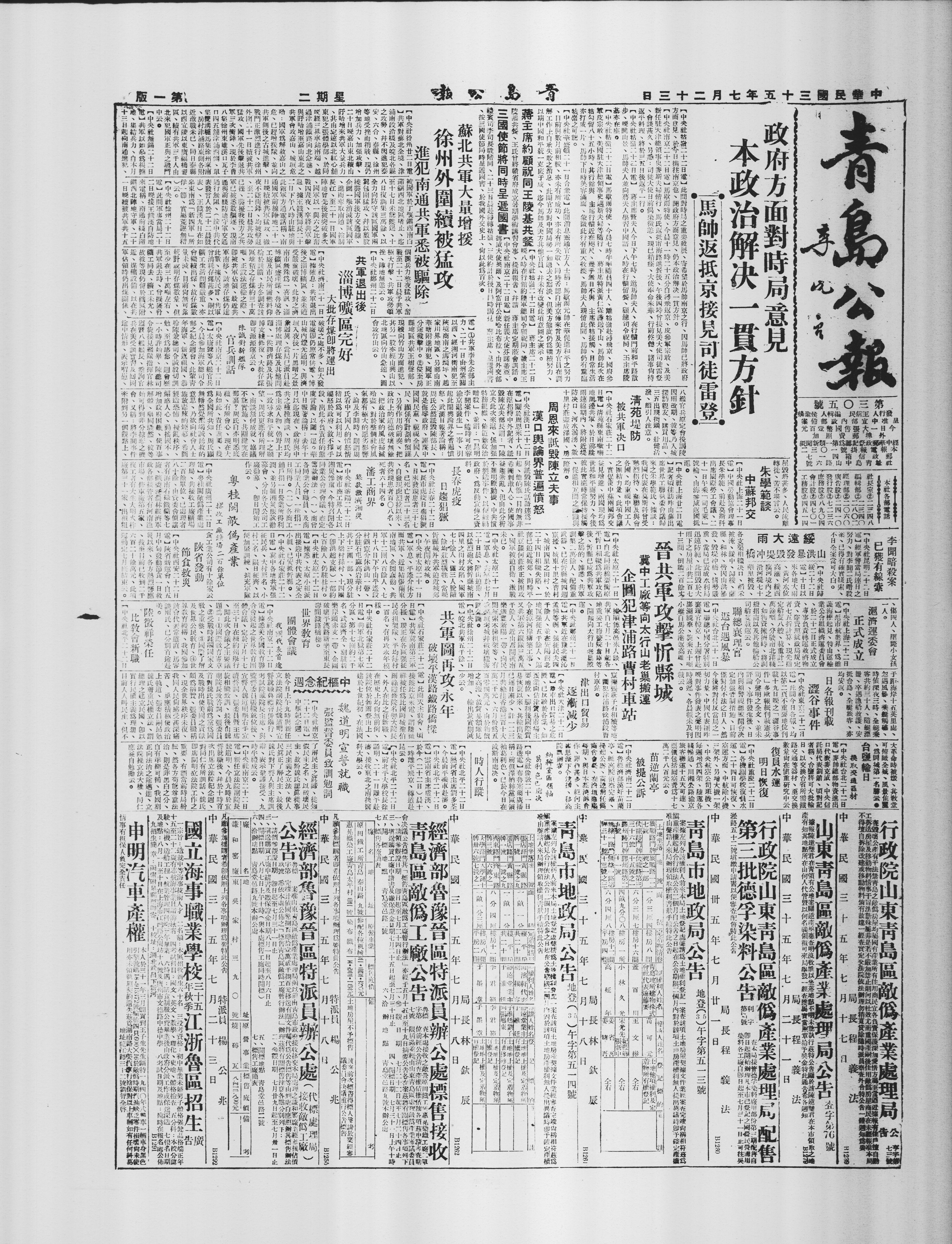 政府方面对时局意见 本政治解决一贯方针 马帅返抵京接见司徒雷登