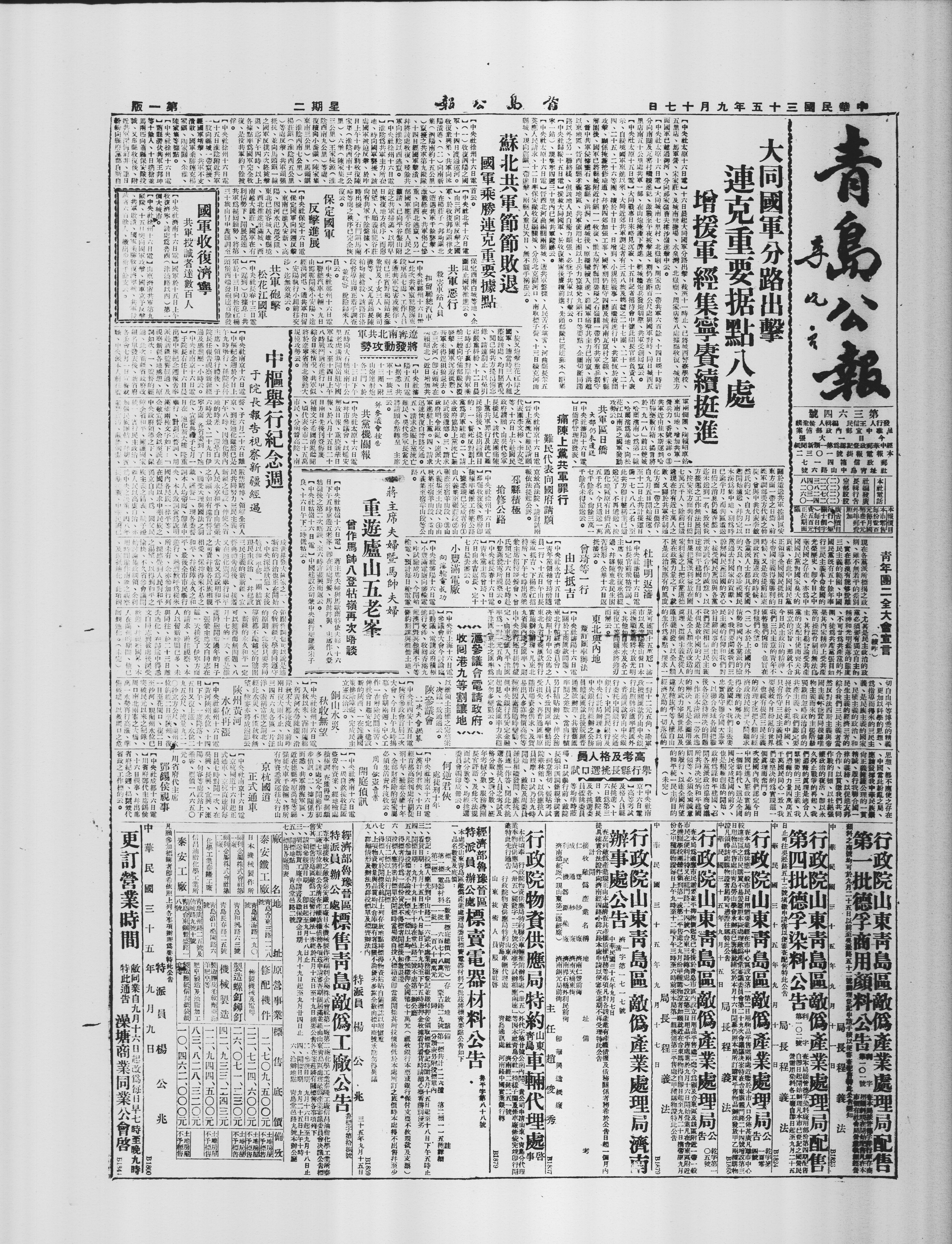 淮阴为共军主力所在地,昨日国军向该地攻击,于下午十时,分别收复该集,并将该地区以西逃散之共军击溃。