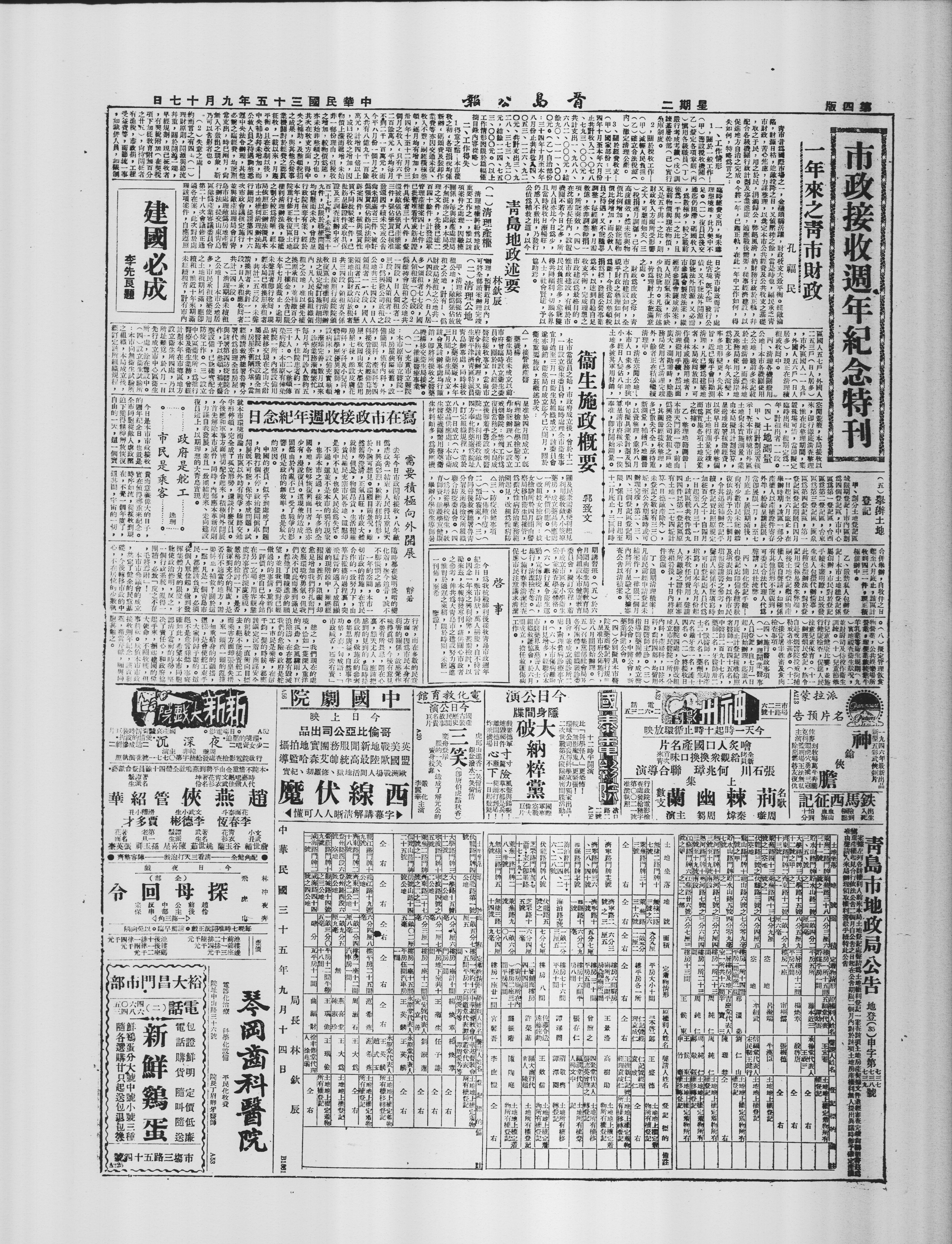 启事今日为我抗战胜利后接收青岛市政周年纪念日,全市同庆,万人称庆,自不待言。因念一年来之兴利除弊,甚需检讨,以励来兹,本报特发专刊,藉供关心市政者之参考,伸共为大青岛市之建设努力迈进。惟对于过迟之来稿,限于时期,未能一一刊布,至希 鉴谅!
