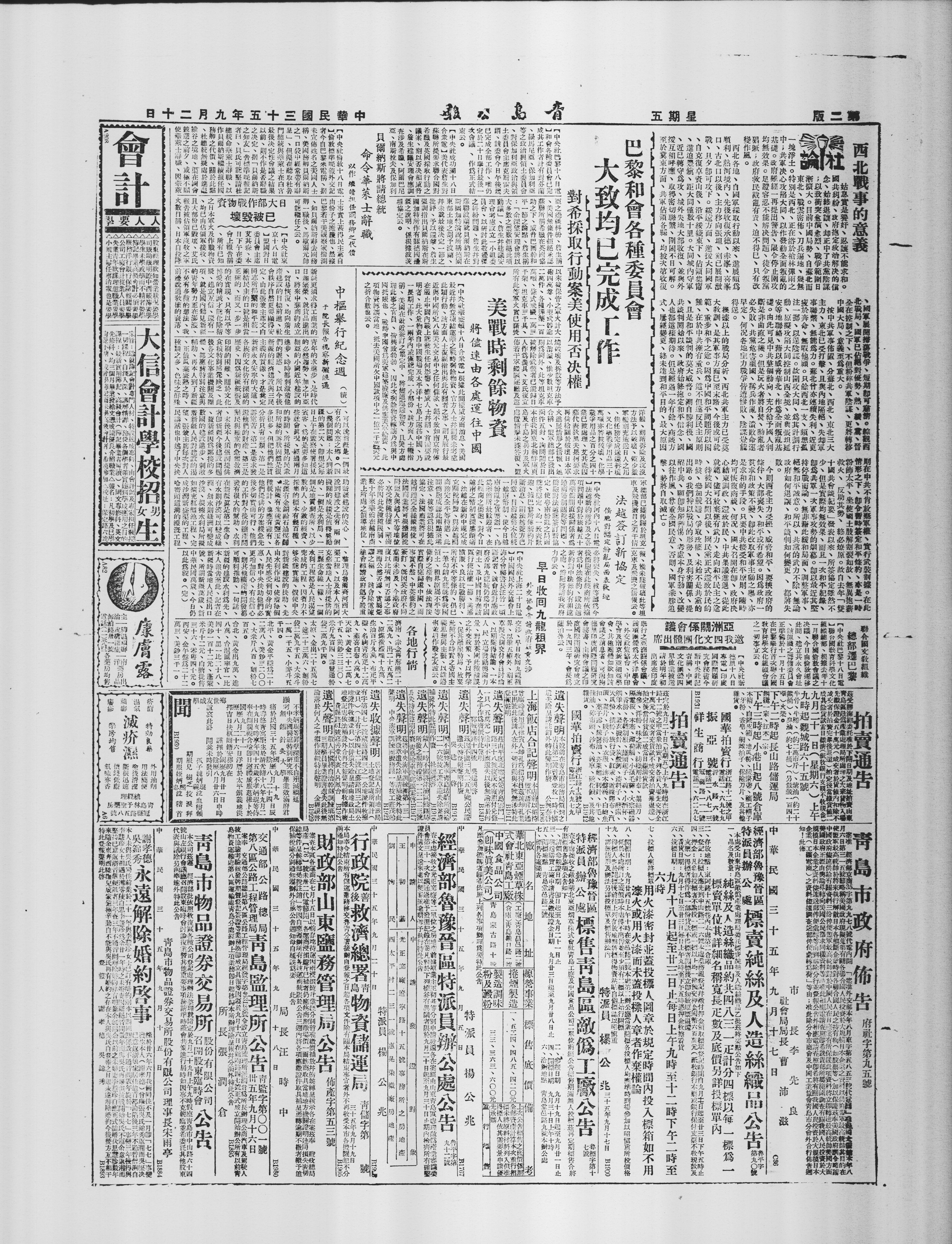兹定于九月二十日(星期五)上午九时起在浙江路十二号之甲,当衆拍卖下列各货,入场先交押金十万元(成交者充货款,不成交者拍卖毕退还)。拍定后,当付货值二成,当日缴清货款。