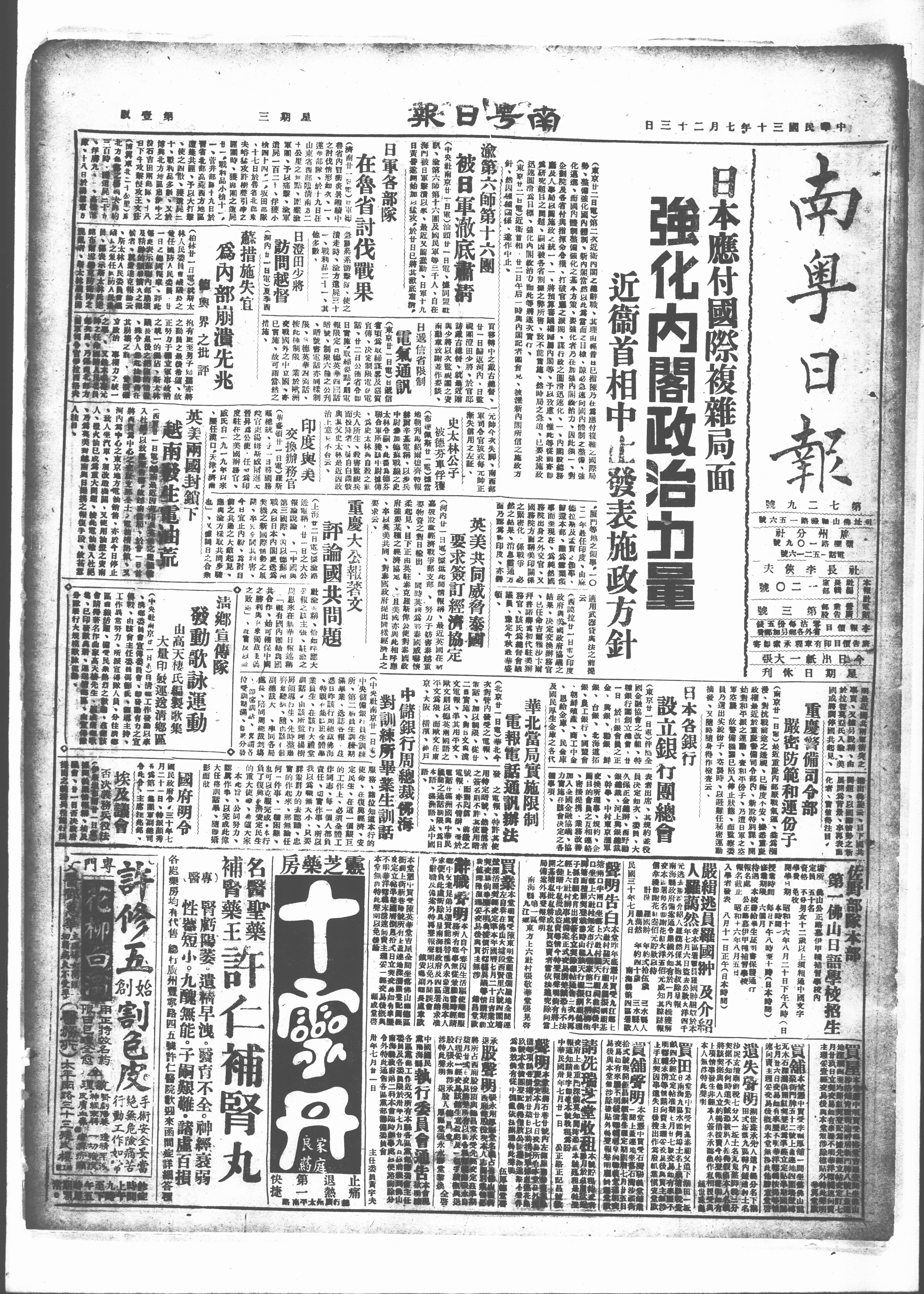 (東京廿二日電第二次近衛内閣之總辭職、其理由昔日巳指陳乃仕為應付複難之國際局