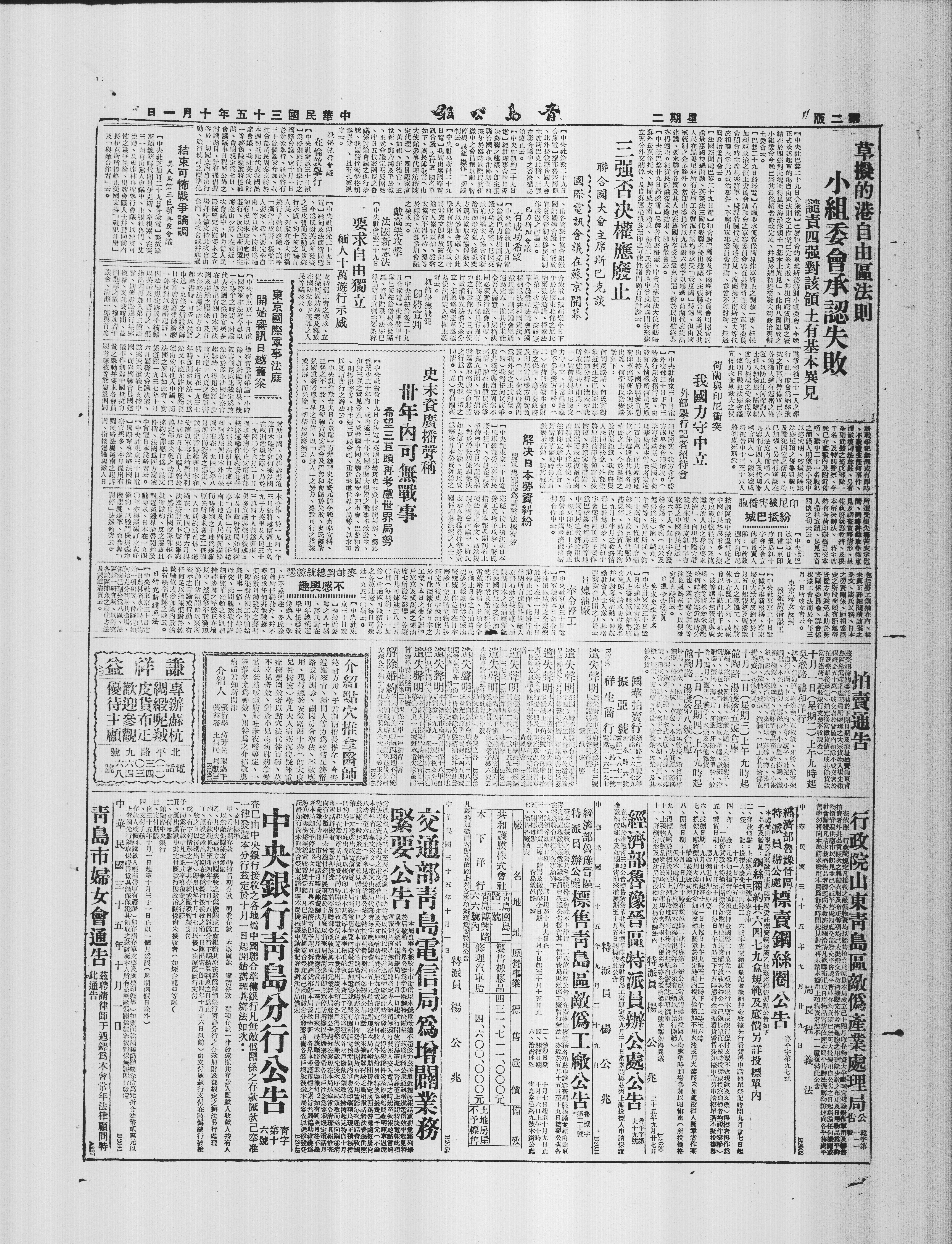 日研究新捕鱼法 【中央社东京三十日电】农林省水产局已开始一项研究,俾确定如何充分利用其渔场。领海已划分为八区,每区设一研究所,以研究各该区捕鱼之最佳方法及制造海货。