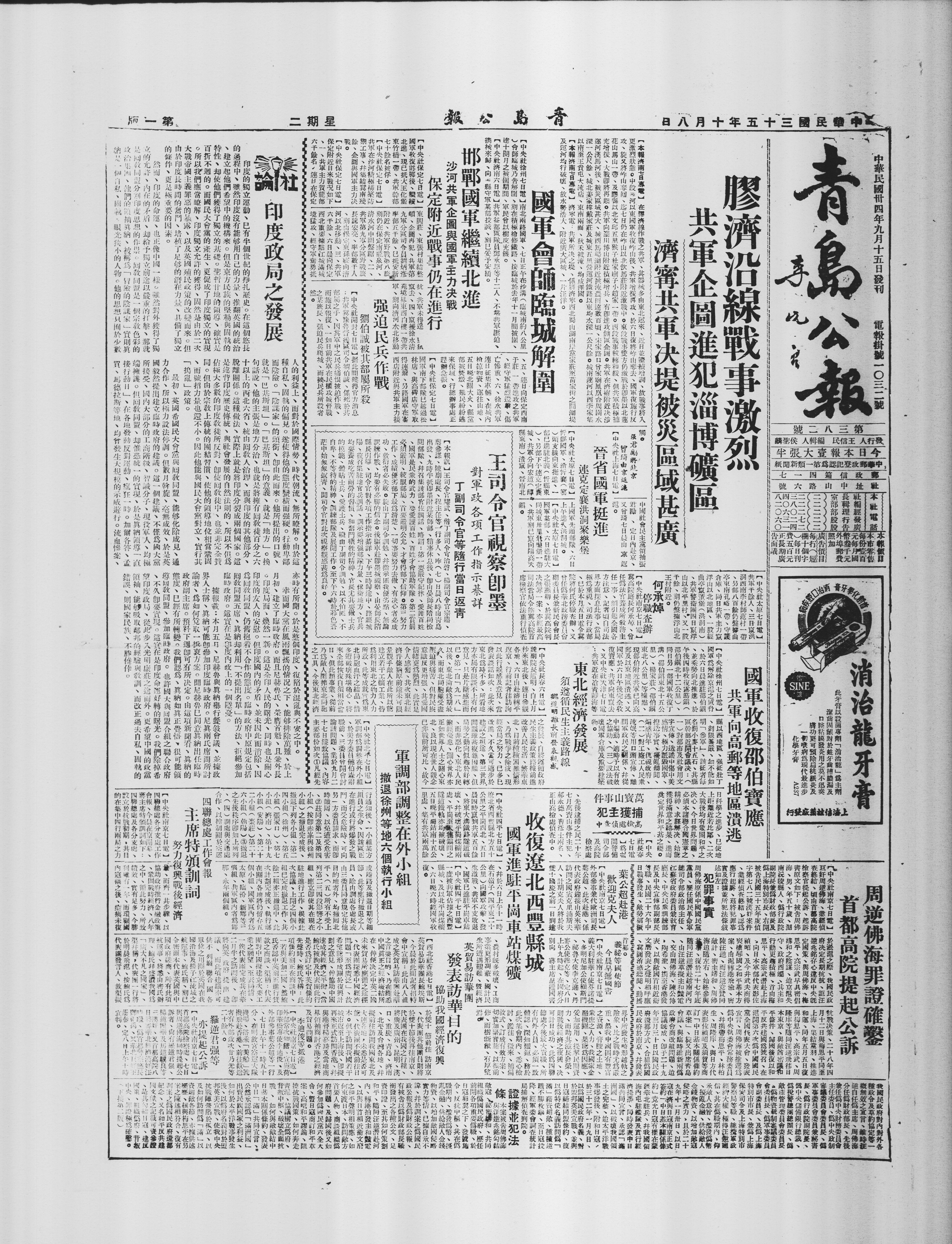 王司令官视察即墨 对军政各项工作指示綦详 丁副司令官等随行,当日返青 【本报讯】王司令官耀武,偕丁副司令官治磐、杨副司令官宗鼎,韩参谋、张副师长、程主任等一行多人,昨(七)日晨八时由青岛出发,九时半抵即墨附近某部,稍事休息后,即由廖师长陪同检阅部队,并召集该部官佐训话,略谓:第一要严守纪律,爱护百姓,国军是民众的武力,要爱护百姓,百姓才会协助军队。第二官长必须严明,统驭部下要清楚,一切事要努力去做,有决心者必成功,敷衍者必失败。旋由丁副司令训勉,并指示匪我优劣点,无论功课作战,均要有必胜的信念。后即驱车赴普东视察,由李师长陪滕长引导,司令官对各项工作指示綦详,下午三时许途中,路经城阳,复召集驻城阳官兵训话,指示要增强部队力量,保卫地方,官兵均要养成吃苦耐劳的习惯,和奋斗牺牲的精神,官长尤其要做士兵的模范,体贴士兵,爱护士兵,嗣由丁副司令训勉,以不怕屈、不自卑、不等待的精神,训练部队及展开工作。至下午六时,始在暮苍茫中,匆匆返青,闻司令官对此次视察感觉甚为良好。