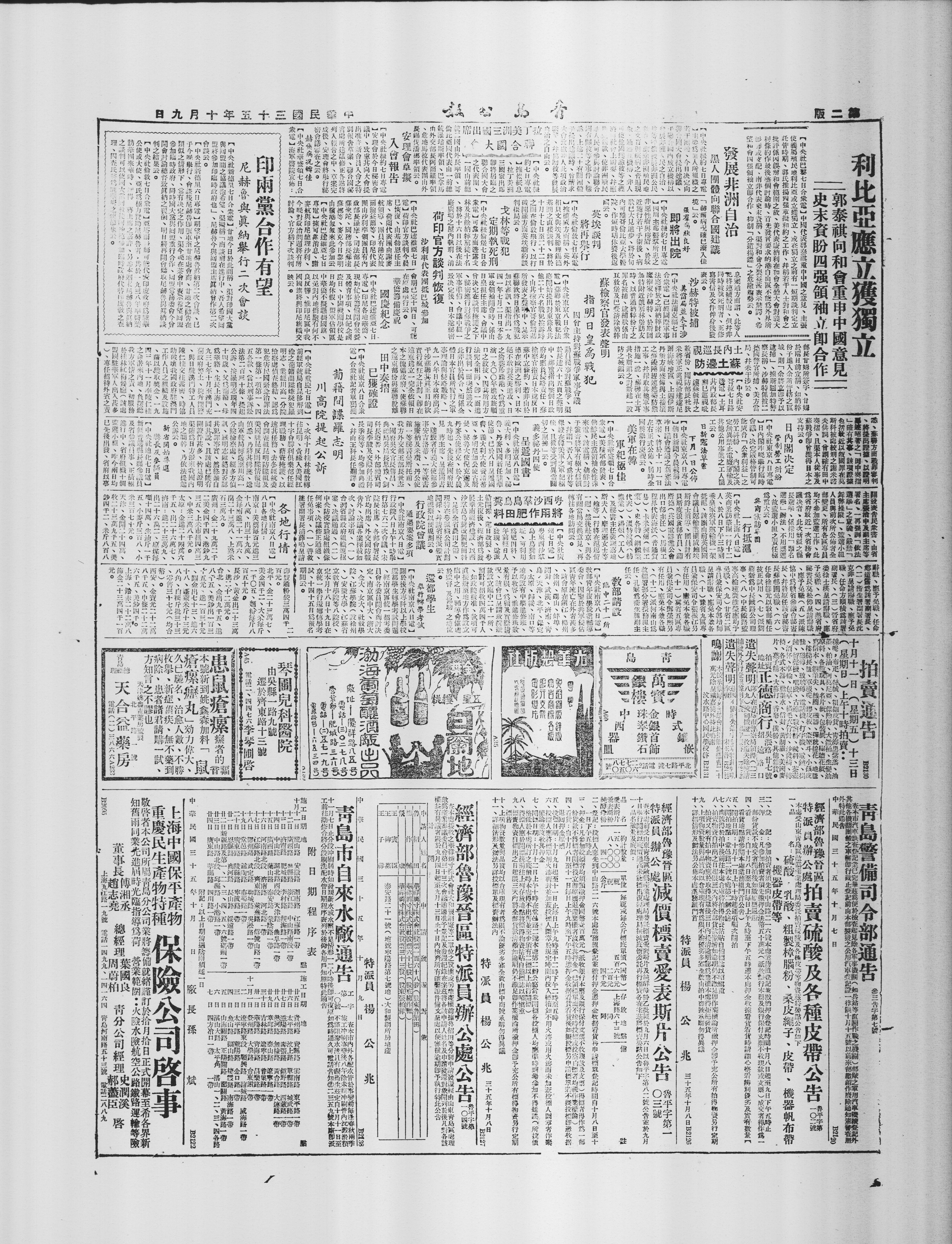 日本投降以后,济南敌产处理局正标爱表斯片经纬纱,兹拟于九月六日以半价发标,于九月十日上午八时在第二办公室并于九月十一日在第一办公室开标,谨将减价条件及行标各条布告如左: