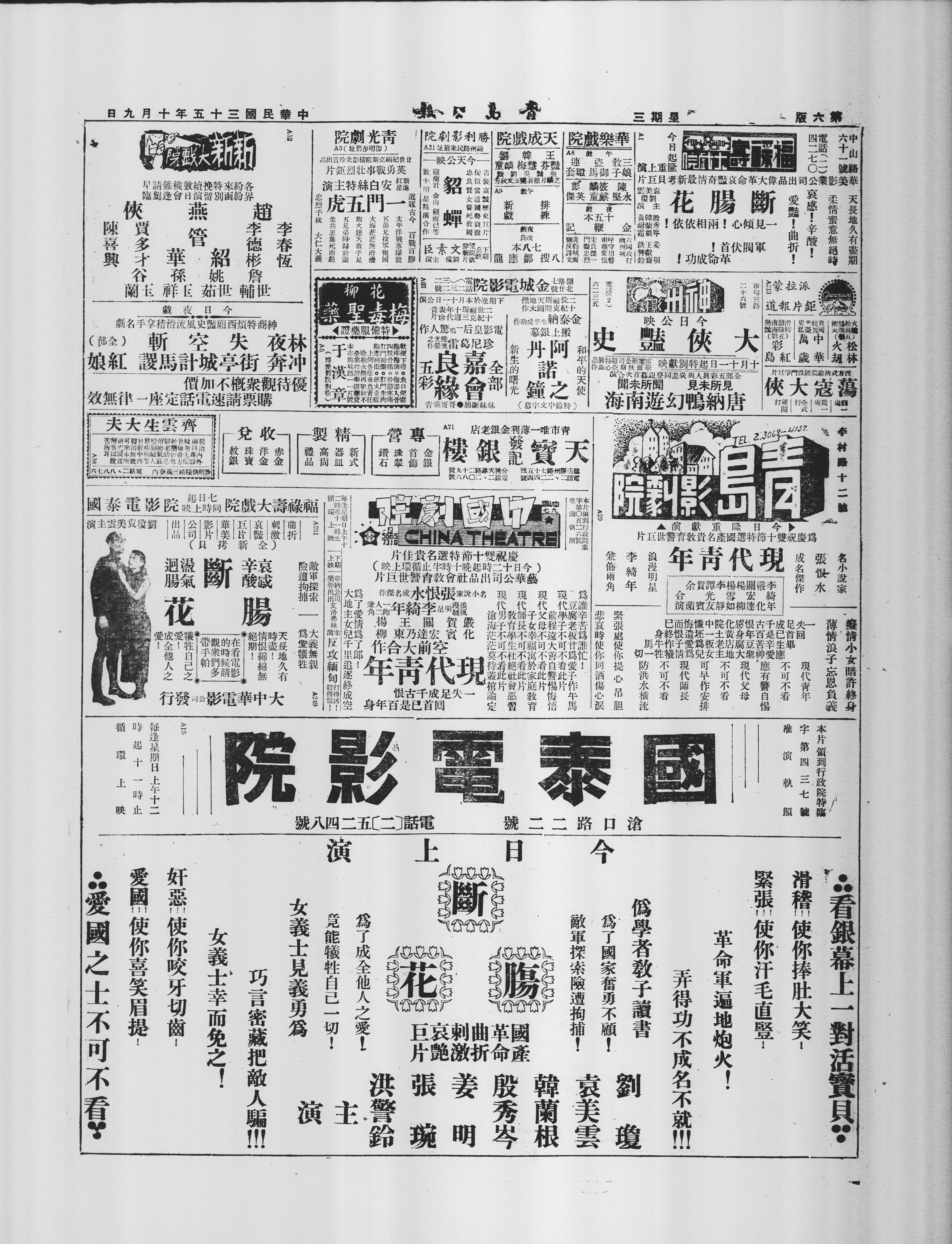### 青天唯一薄利金银老店 A71 天寶發記銀樓 - 金银首饰 - 珠翠钻石 - 专营 **精制** - 新式器皿 - 高尚礼品 **收兑** - 赤金 - 洋金 - 珠宝 - 纹银 **总号**:古州路七十号 电话:二二四二四 **分号**:奉天路二十九号 电话:二二○八六