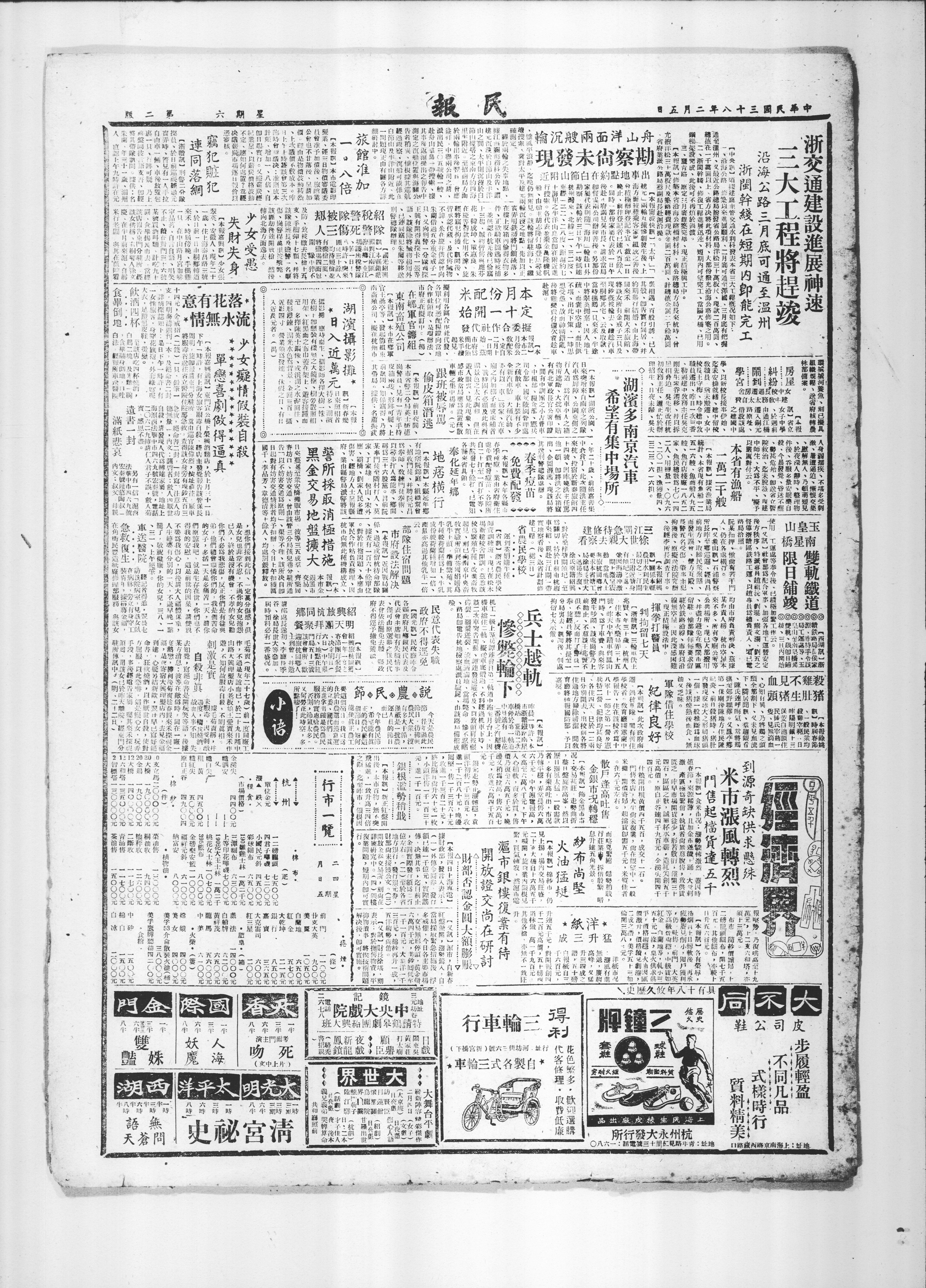 【本报嘉兴通讯】东门宣公桥下荣兴酒面店,于上月三十一日下午一时许,有上海女旅客服毒自杀。经店主发觉报告该管保长将服毒者送往省立医院住院部急救,查得该女身旁有现钞五百三十四元,金戒指(二钱)一枚,铅笔一支,四期海涛期刊一本,及绝命书二封。一封写"注意入功德无量",内文:谨启者:做人内厌世自杀,请发现人代为转达家属,地址上海泗西法华中市四六九号宏泰号,电话二〇六二九转调仁人君子不误,做人菊宝,感恩不尽。