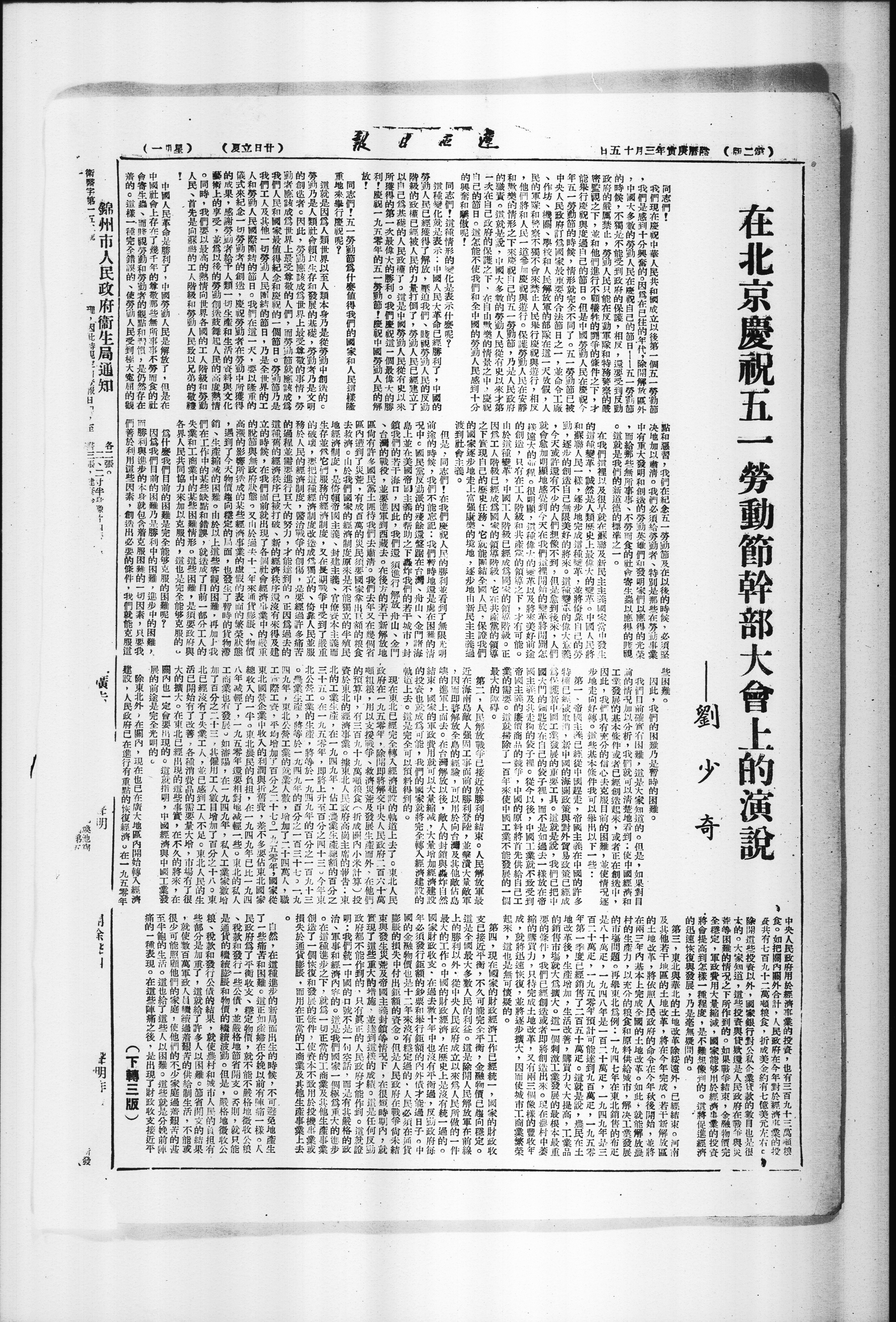 在北京庆祝五一劳动节干部大会上的演说--刘少奇