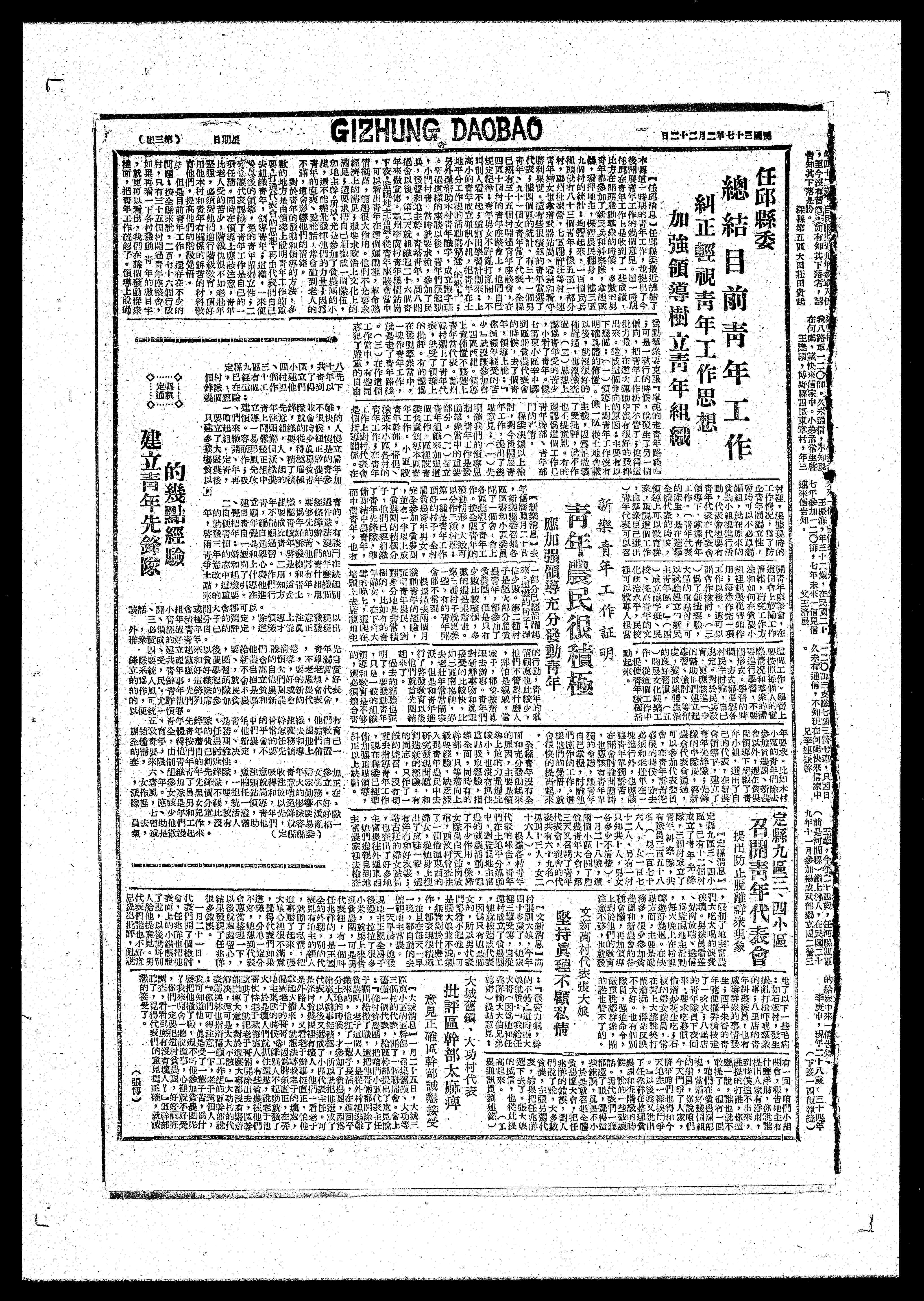任邱縣委 總結目前青年工X作俗 斜正輕青年工作思想 加强領導樹立青年組織