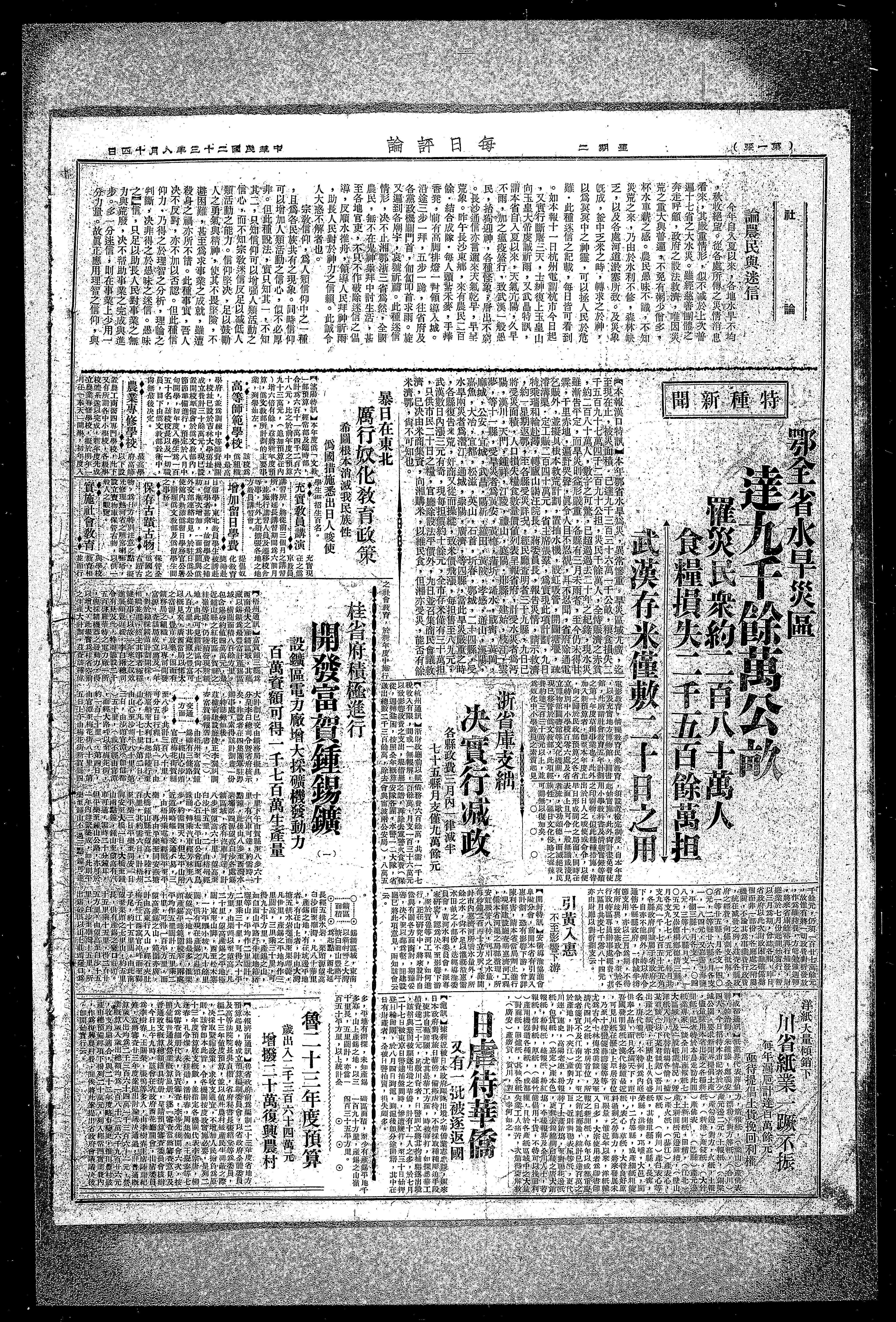 【本报汉日特训】本年鄂省水旱为灾,异常惨重,旱灾区域尤广,迄至现在止,被灾面积,已达九千三百三十六万一千公亩,粮食损失二千五百九十七万四千二百九十公担,灾民千余万人,全恃赈济之赤贫。