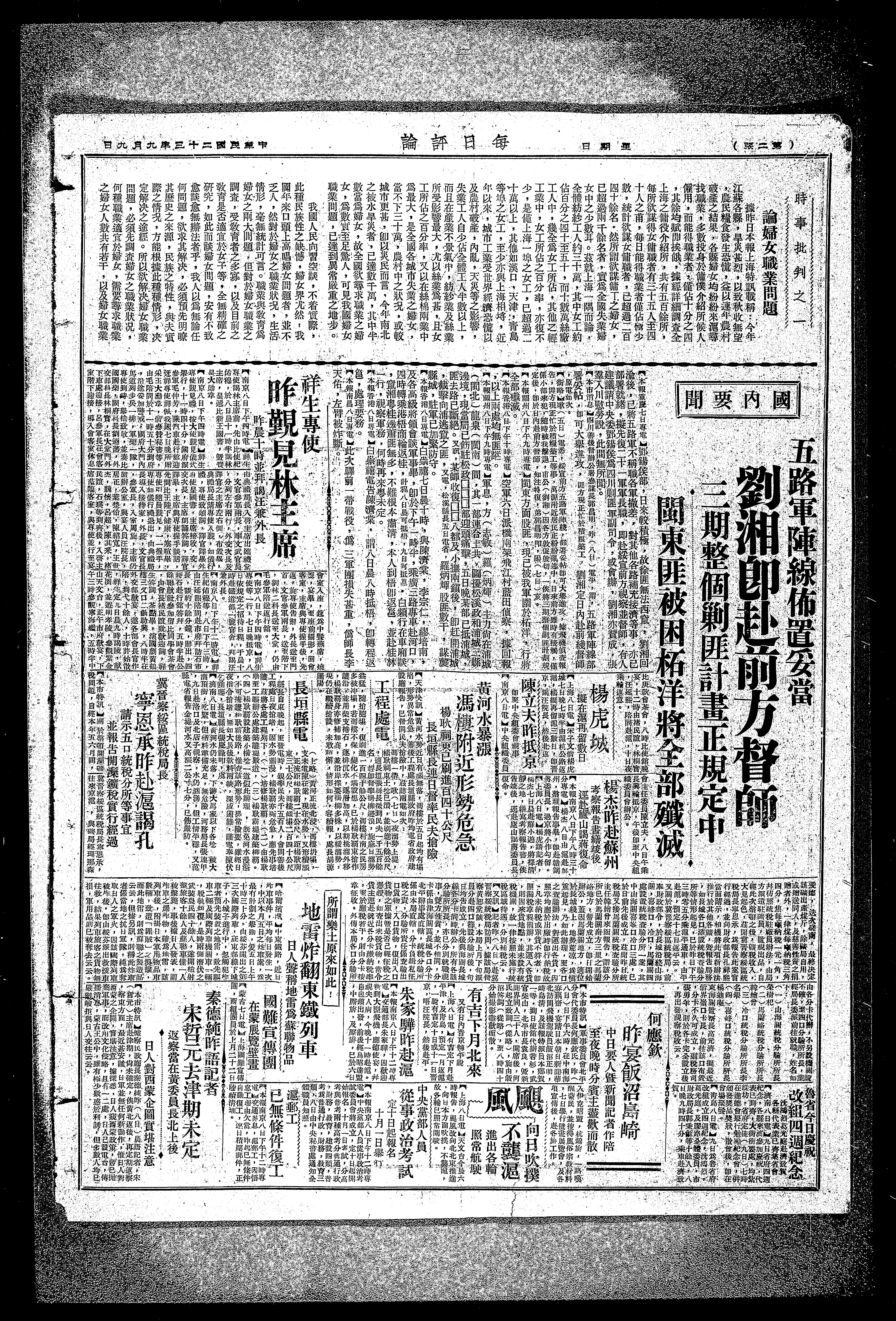 国内要闻五路军阵线布置妥当刘湘即赴前方督师