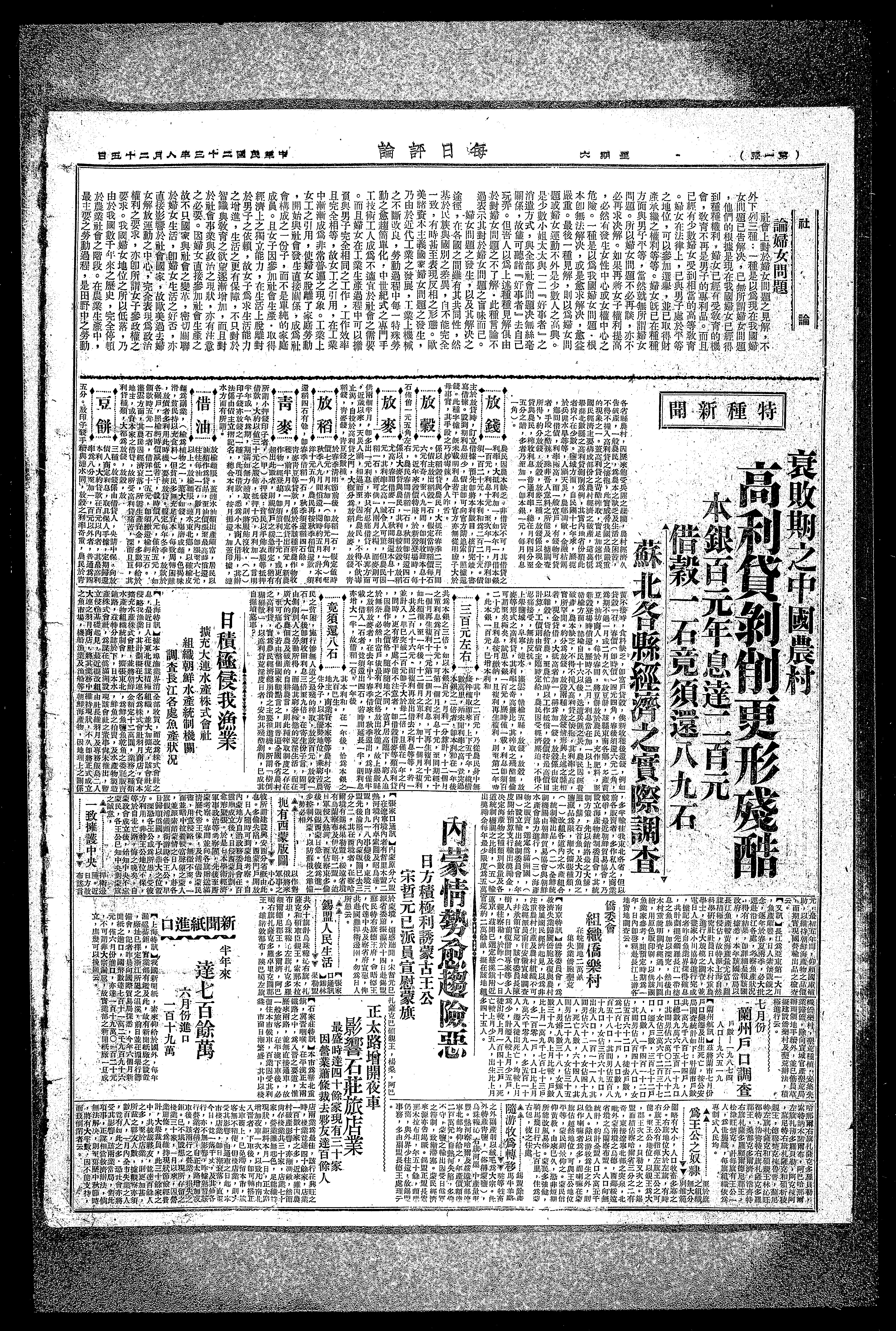 地主,商业资本家等等农村中之寄生分子,以其优势地位,乘穷苦农民之贫困,施行惨无人道之最残的榨取,放款百元,放榖一石,一年后即须收回利息三倍至九倍。
