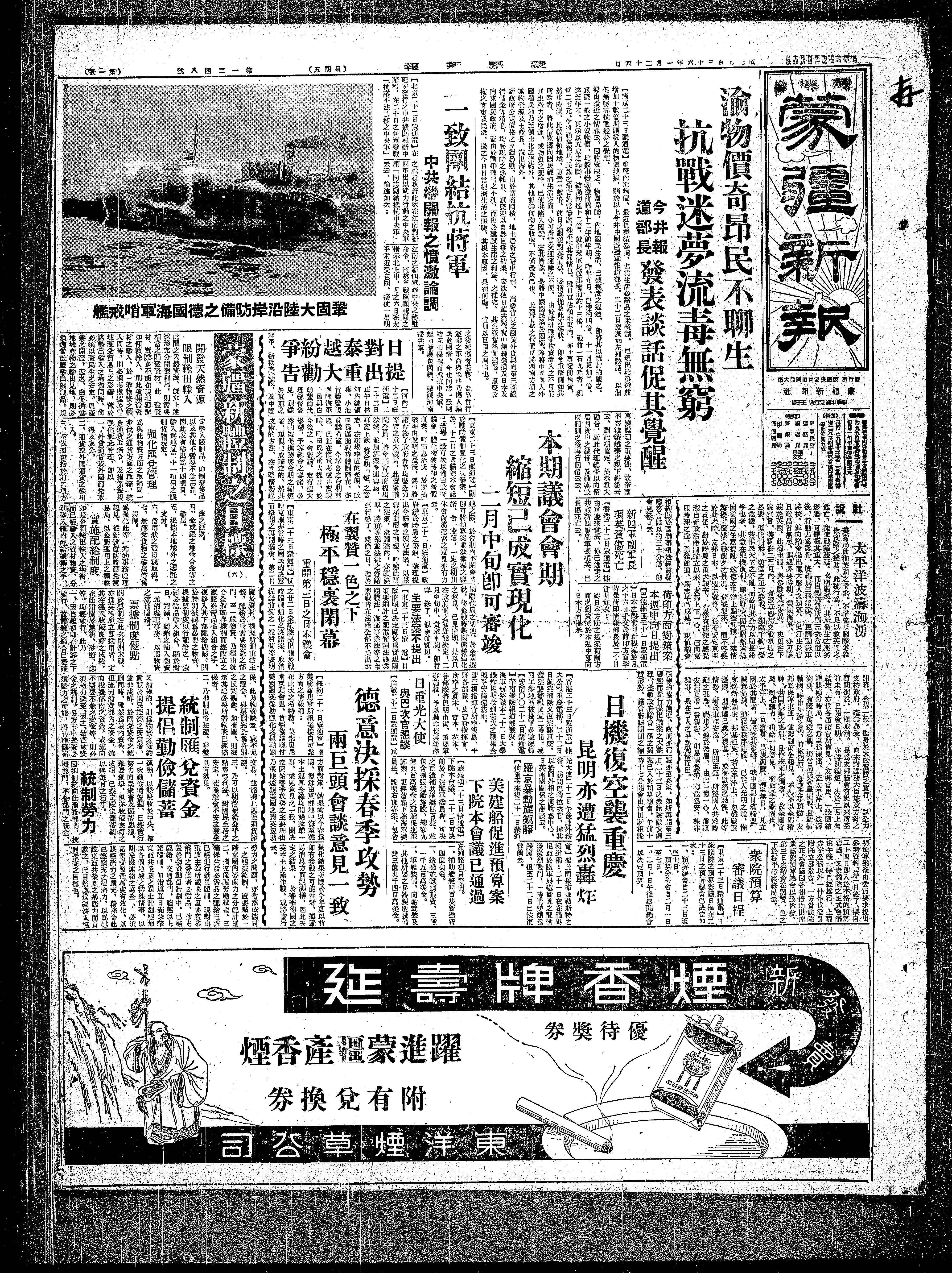 【华盛顿二十二日蒙通电】下院本会议二十二日可决前於下院海军委员会,可决之新造补助舰艇四百艘、并