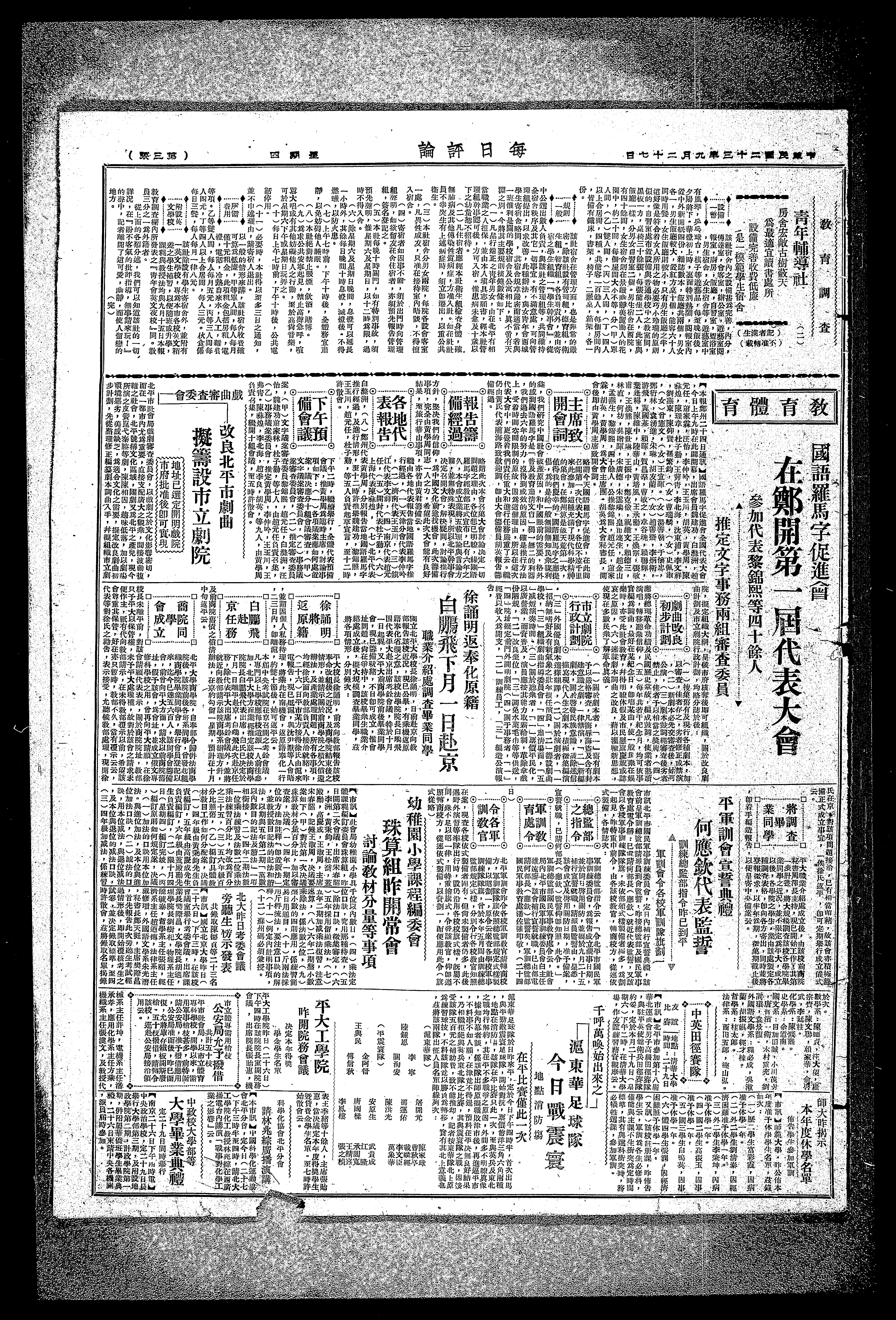職業介紹處調查畢業同學,國立北平大學校長徐誦明,日前赴京向教部報告該校近况,現已公畢,有乘機返原籍奉化省親之意,該校法學院院長白鵰飛因代表平大赴京出席考銓會議 特於十月一日起程,又會,現巳籌備就緒,不日卽可成立,惟會平大前商學院前後畢業同學址問題人尙在爭持中,該校畢衆生職業介十紹處成立後,擬大規模調查畢業同學,茲將各項情形,分別錄次: