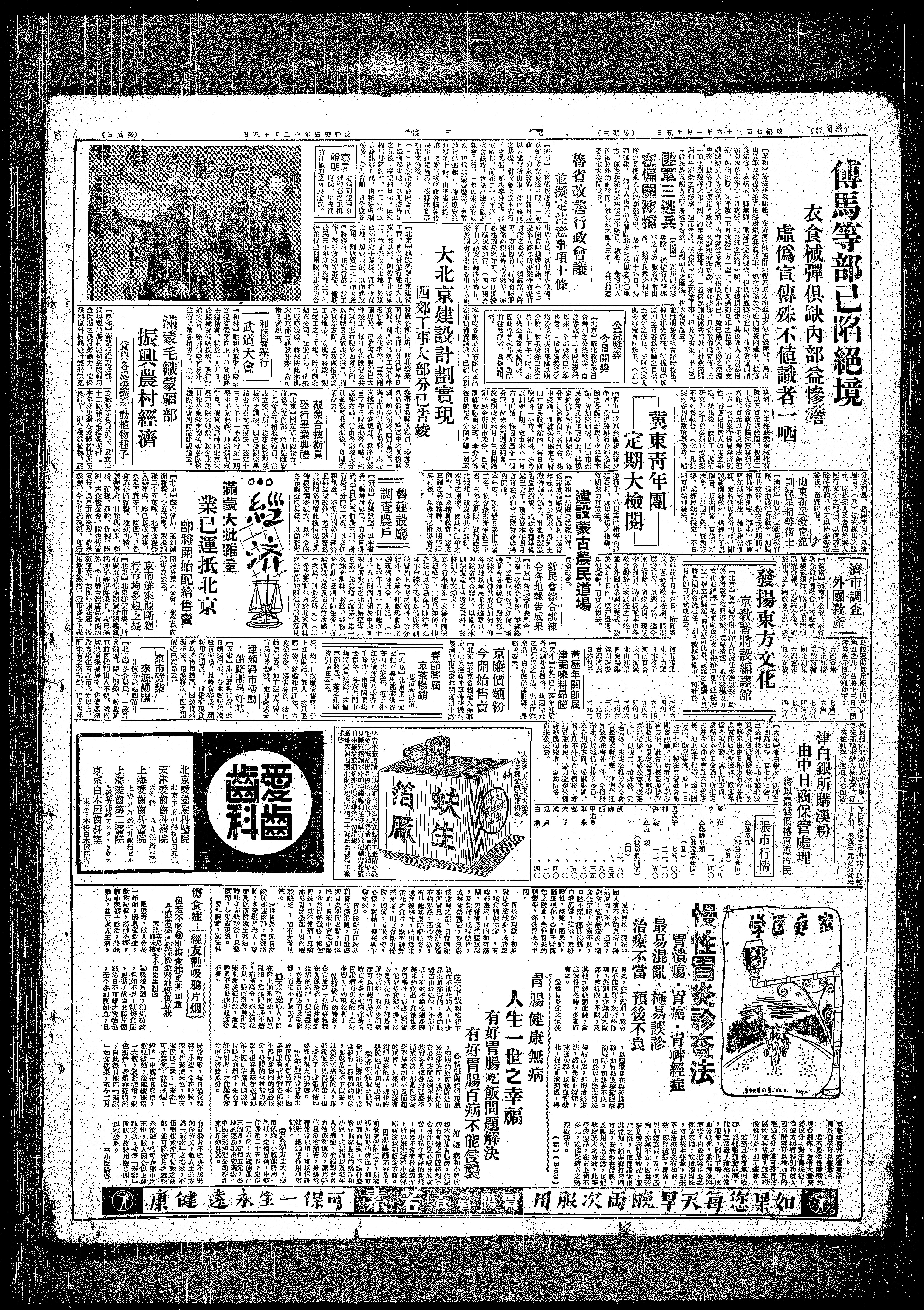 【北京】北京食糧輸入辦事處、此次接收陸軍特務機關接濟京市民衆年關麵粉十萬袋、均一律按廉價售賣、于十五日開始、每人一次只限購一袋、該處昨已通知、六食糧公會、轉告各商、禁止抬價售賣