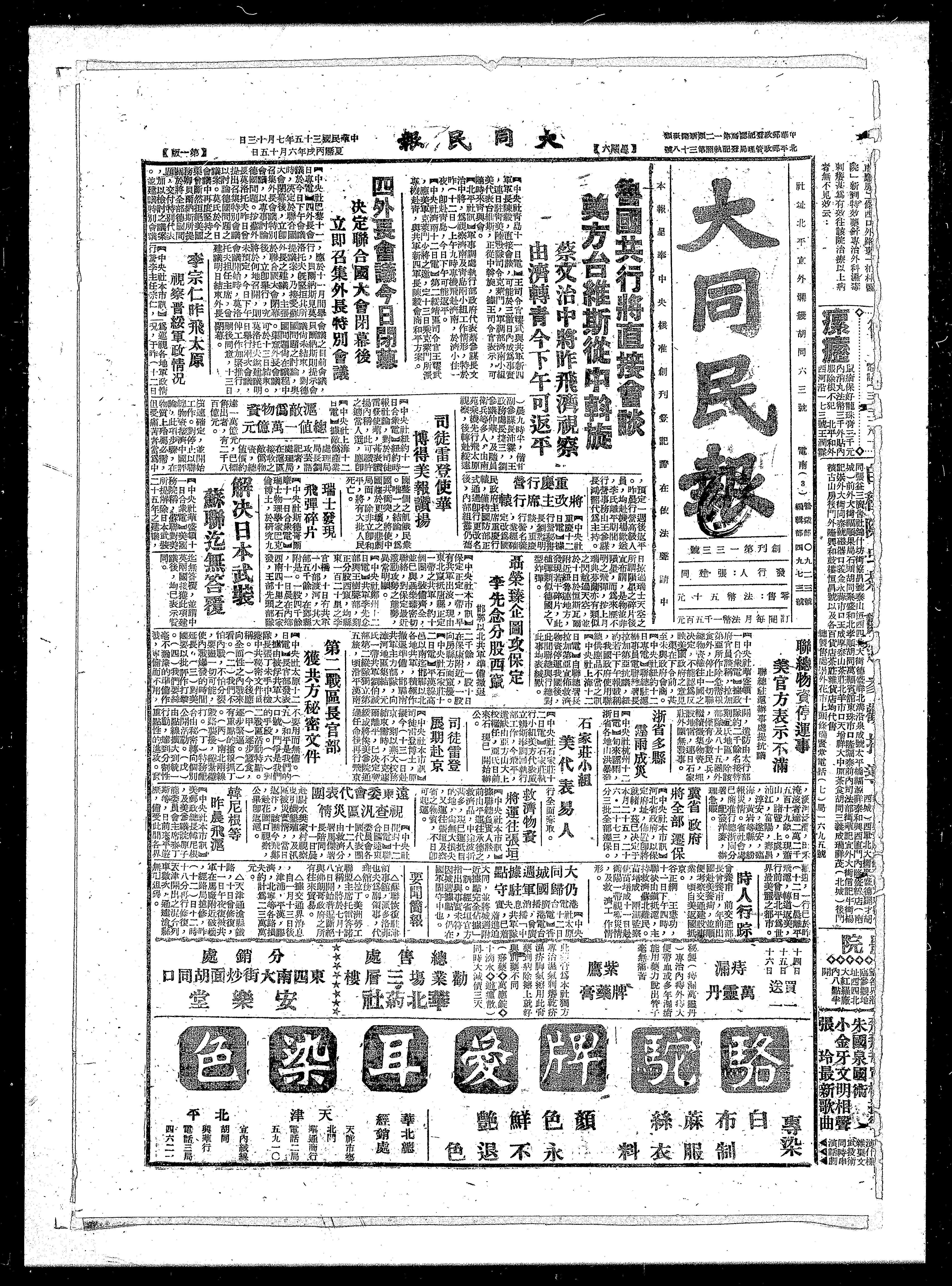 李宗仁昨飞太原 视察晋绥军政情况