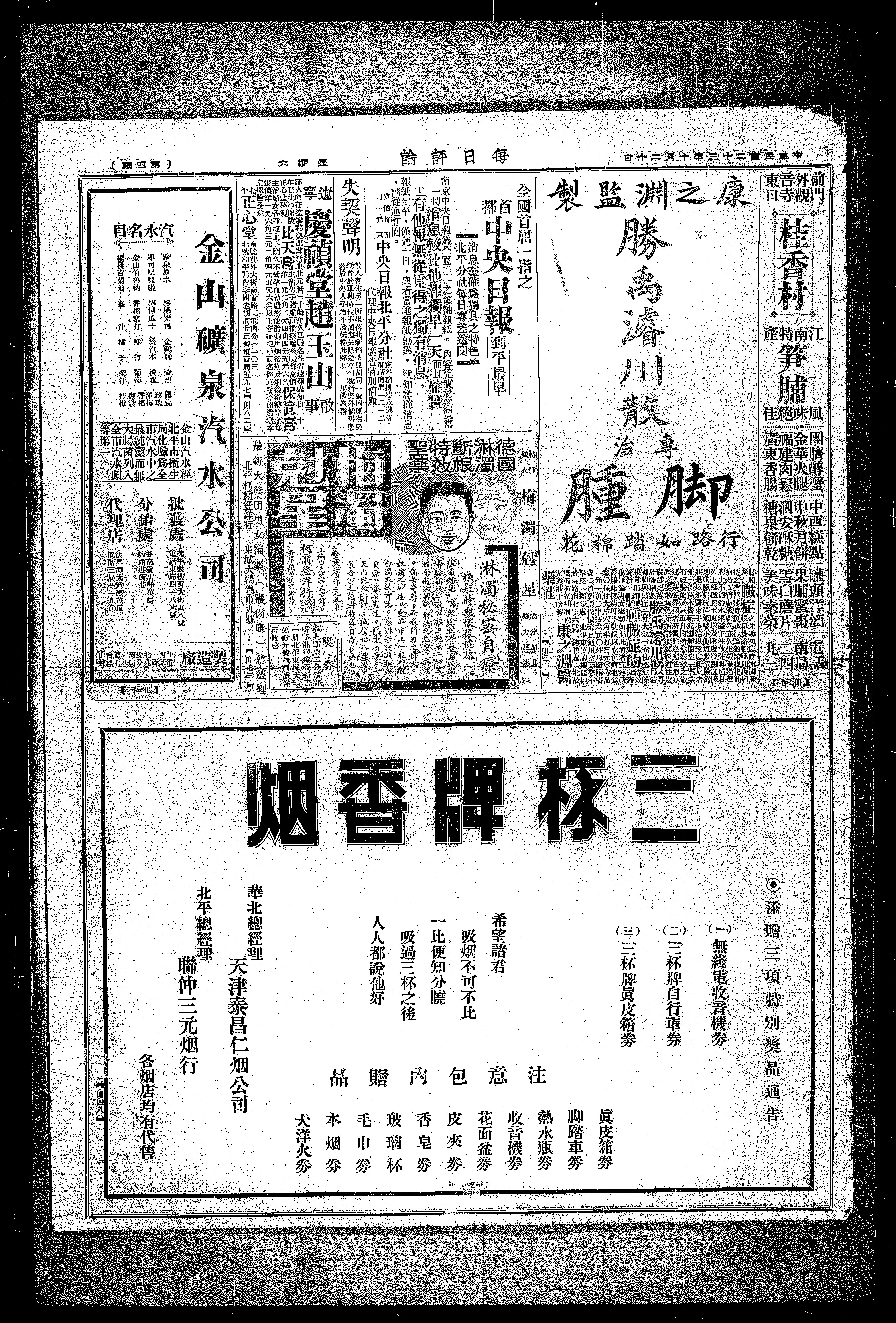金山汽水经北平市衙生局化验为全市汽水中之最纯净而无大肠菌列入全市汽水头等第一