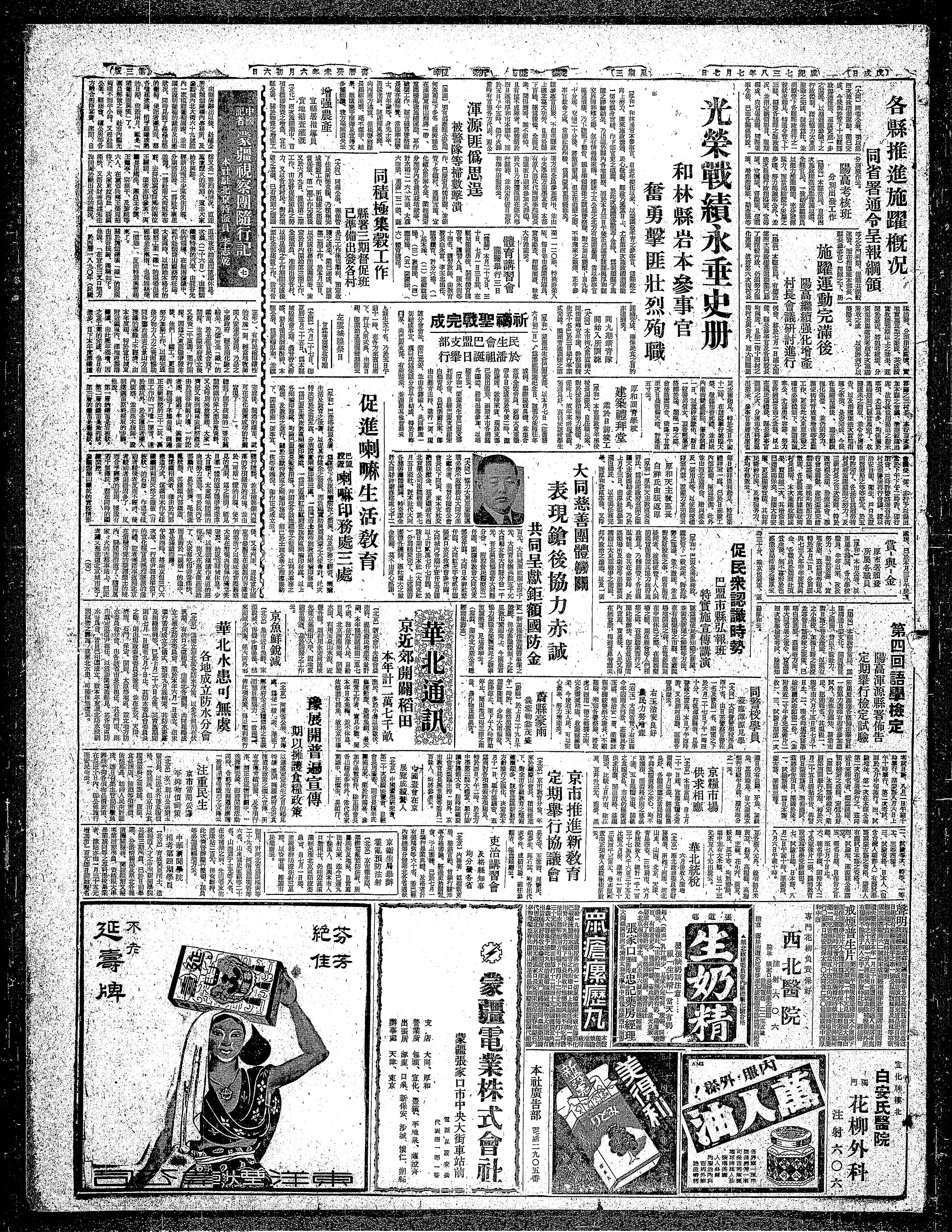 之详细精果、乃出巡於县内各地膜察、而於本月三日午後E出巡陔县与和县