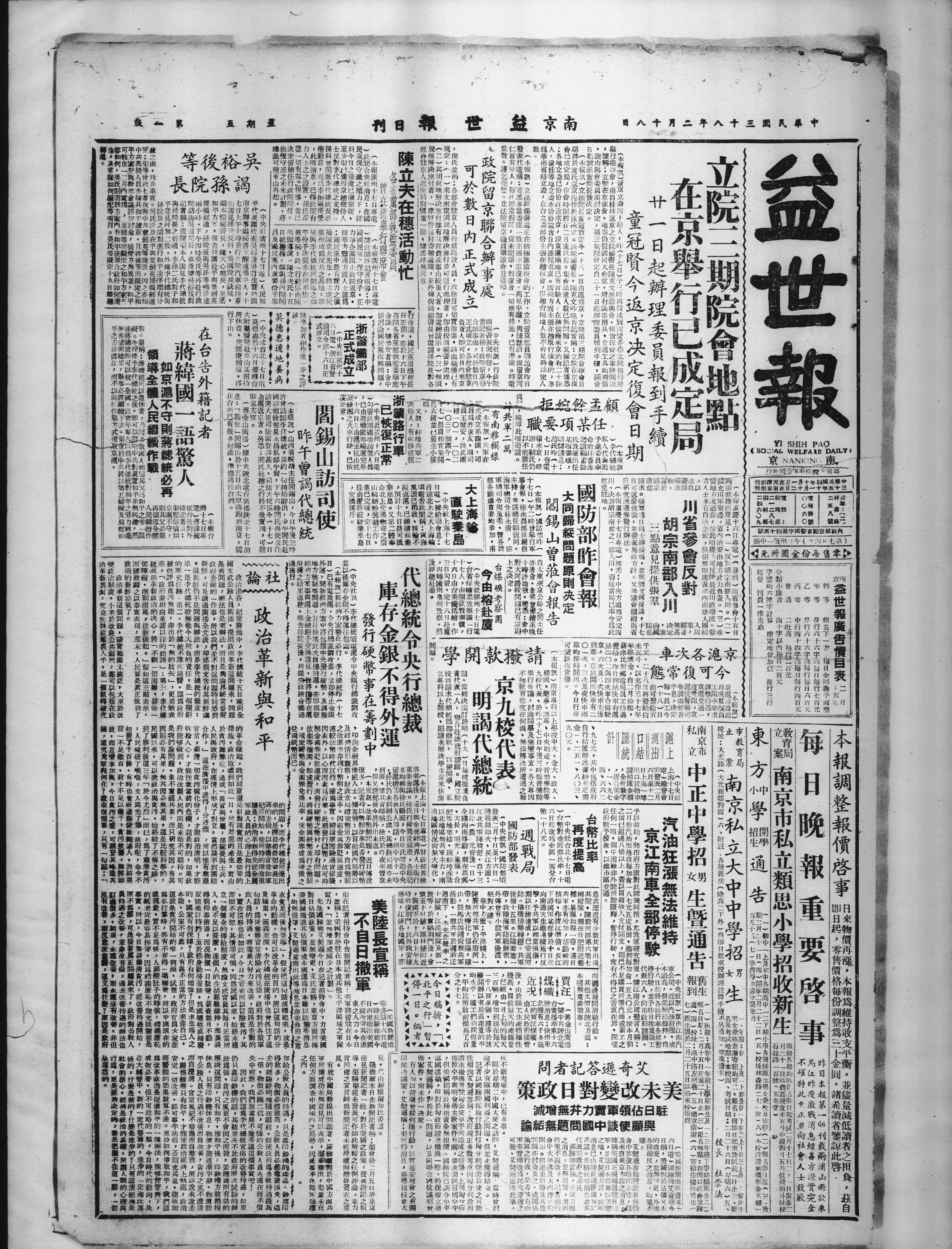 ,交換煤斤。 晨由灑啓碇駛秦皇島 業巳完竣 定十七日 山輪廼粉装載工作· 命北上交換物資之唐 秦皇島。又第二艘奉 ,預計十九日晨可抵 擬返滬·已繼讀前進 風浪已稍戕·該輪不 頃電吿此間稱:黄海 首途北上之大上海輪 日電一據船聯會息: 一中央社上海十七