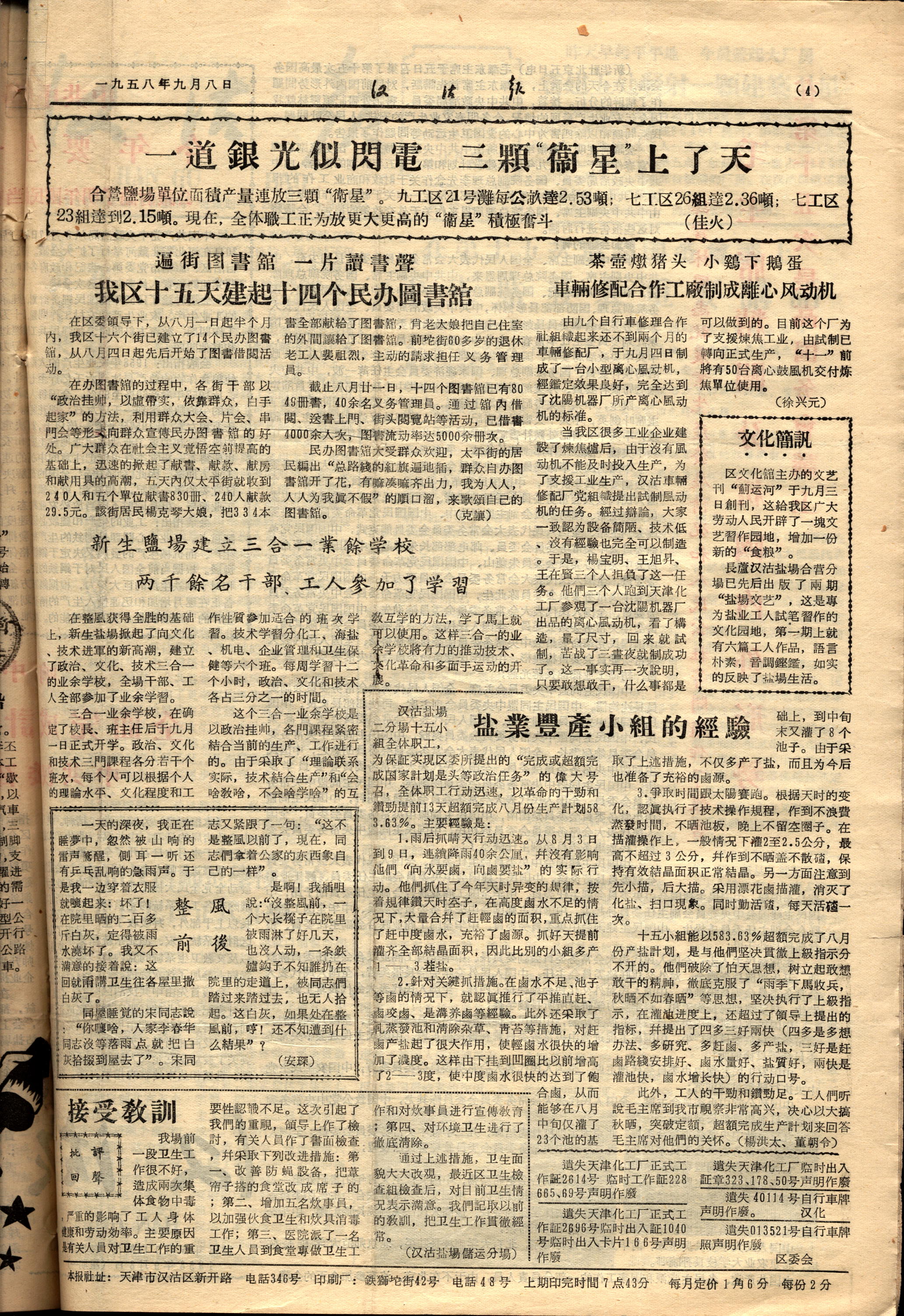 在区委领导下,从8月1日起,半个月内,我区16个街已建立了14个民办图书馆,从8月4日起先后开始了图书借阅活动。