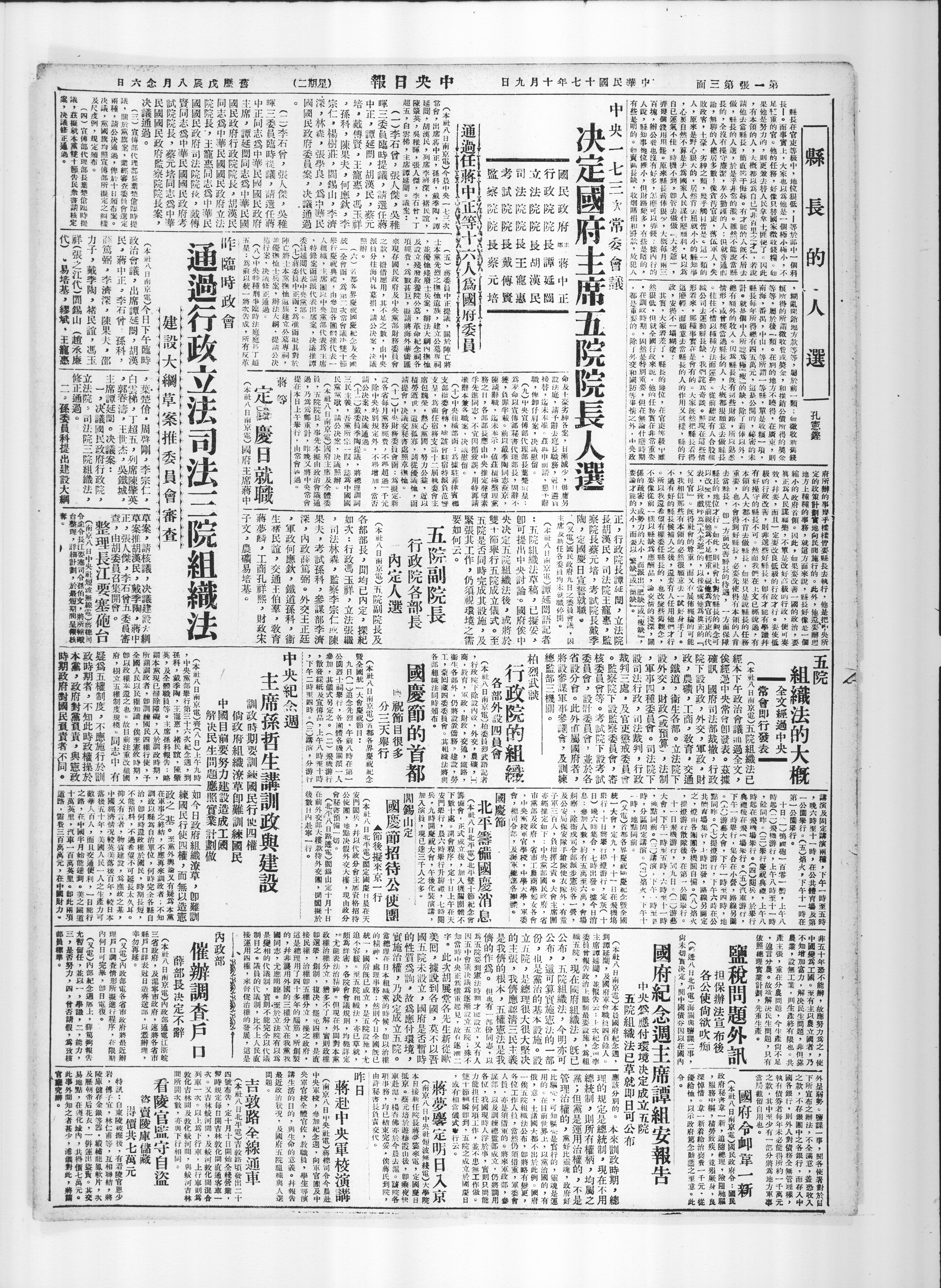 决定国府主席五院院长人选