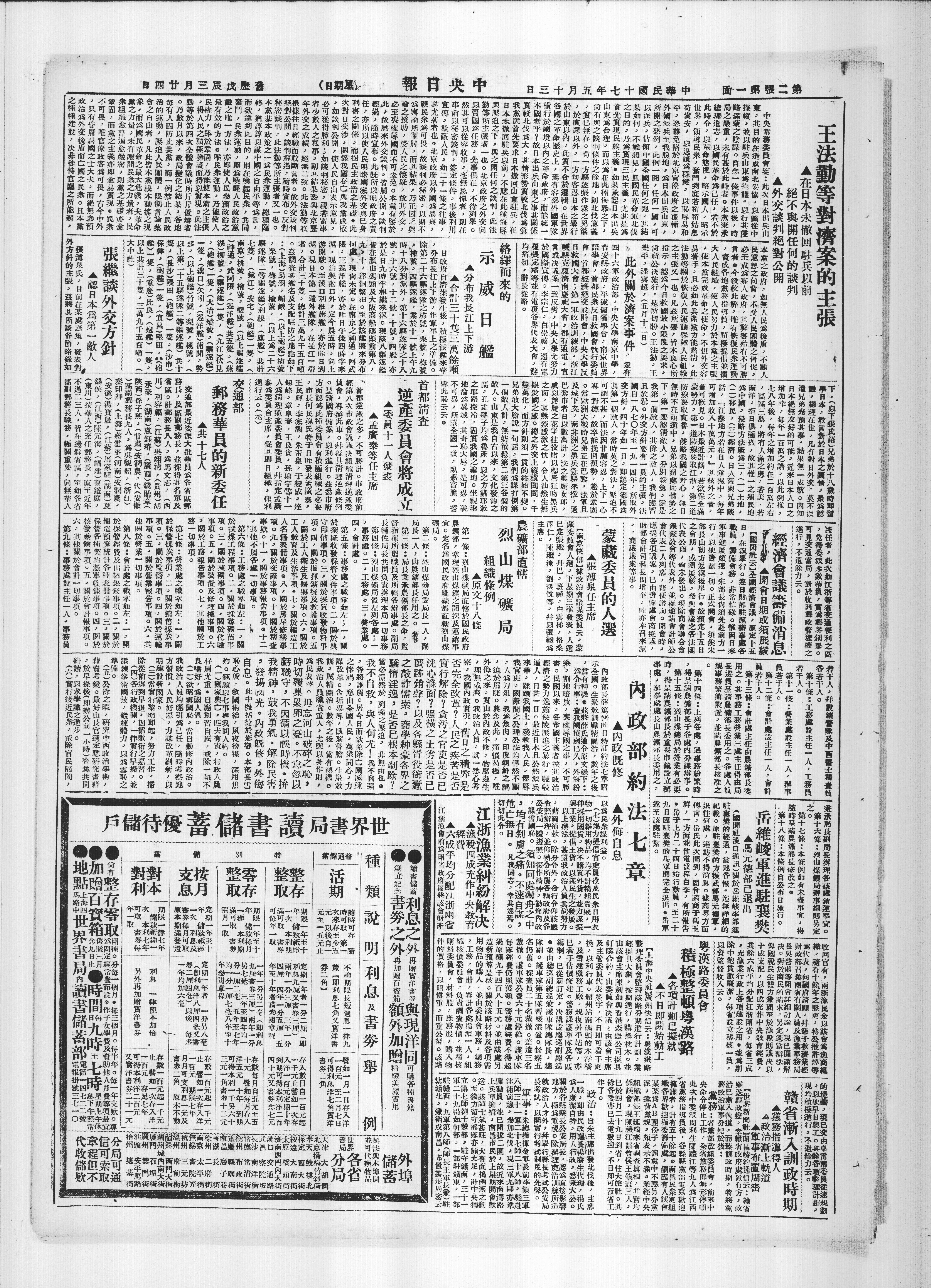 還有四十六軍政治部,中央大學南京中學,吉安縣政府,平遠留省學會,首都民衆反日救濟國會執行委員會,首都經濟絕交設計會,中央大學反日救國大會;第一軍政訓練部,浙江縣克複濟南慶祝大會,都有通電,宣言或決議案一致反對,中央大學尤努力于國際宣傳。李宗仁,白崇禧,還有電覆張定璠等並有電覆各界代表大會,辭均痛徹,辭長從略。