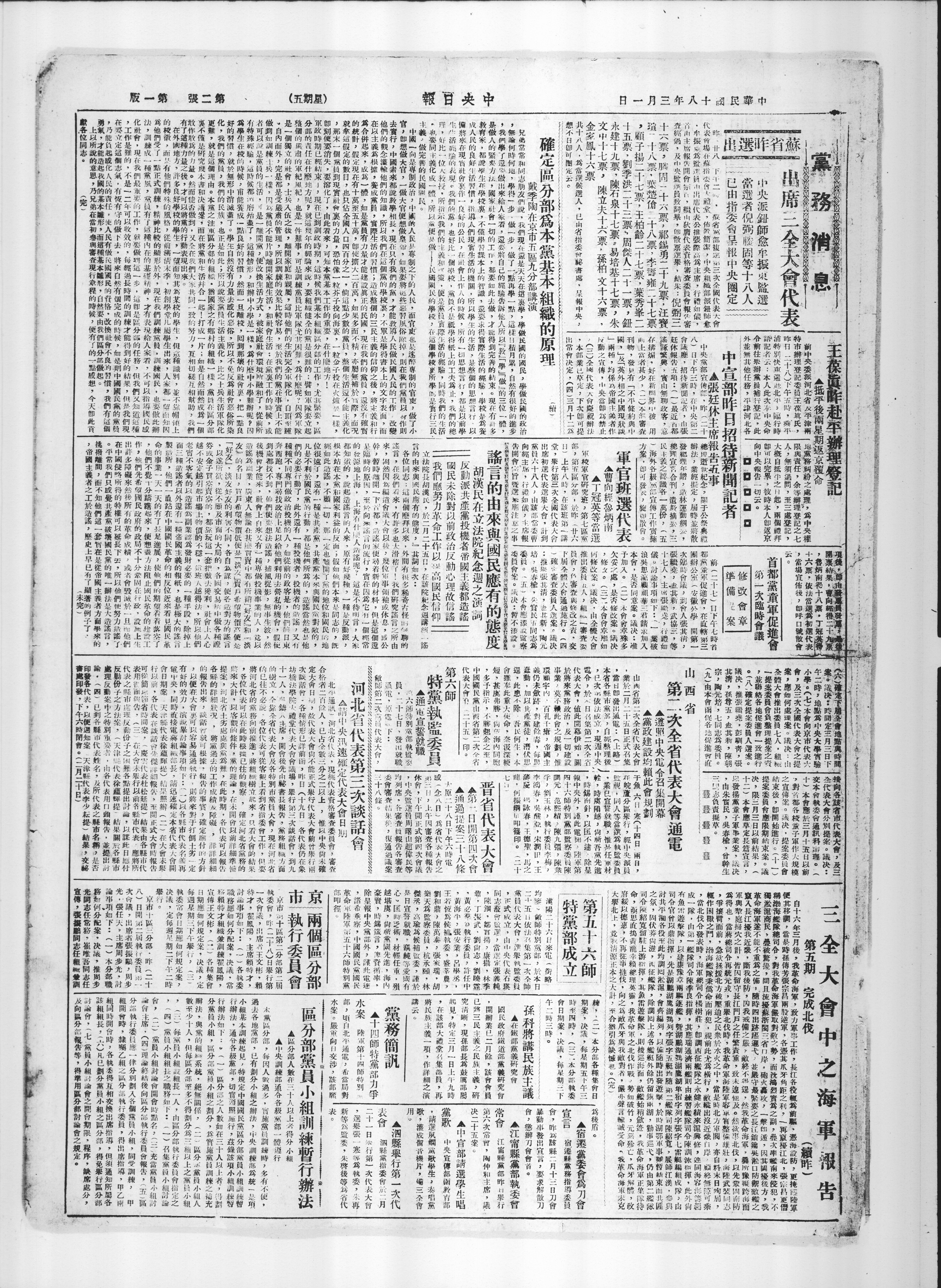昨(廿八)下午二时,苏省党部复选第三次全国代表大会代表会场在苏指委会大礼堂,布置简洁,中央组织部派×师愈,牟振东为监选员。