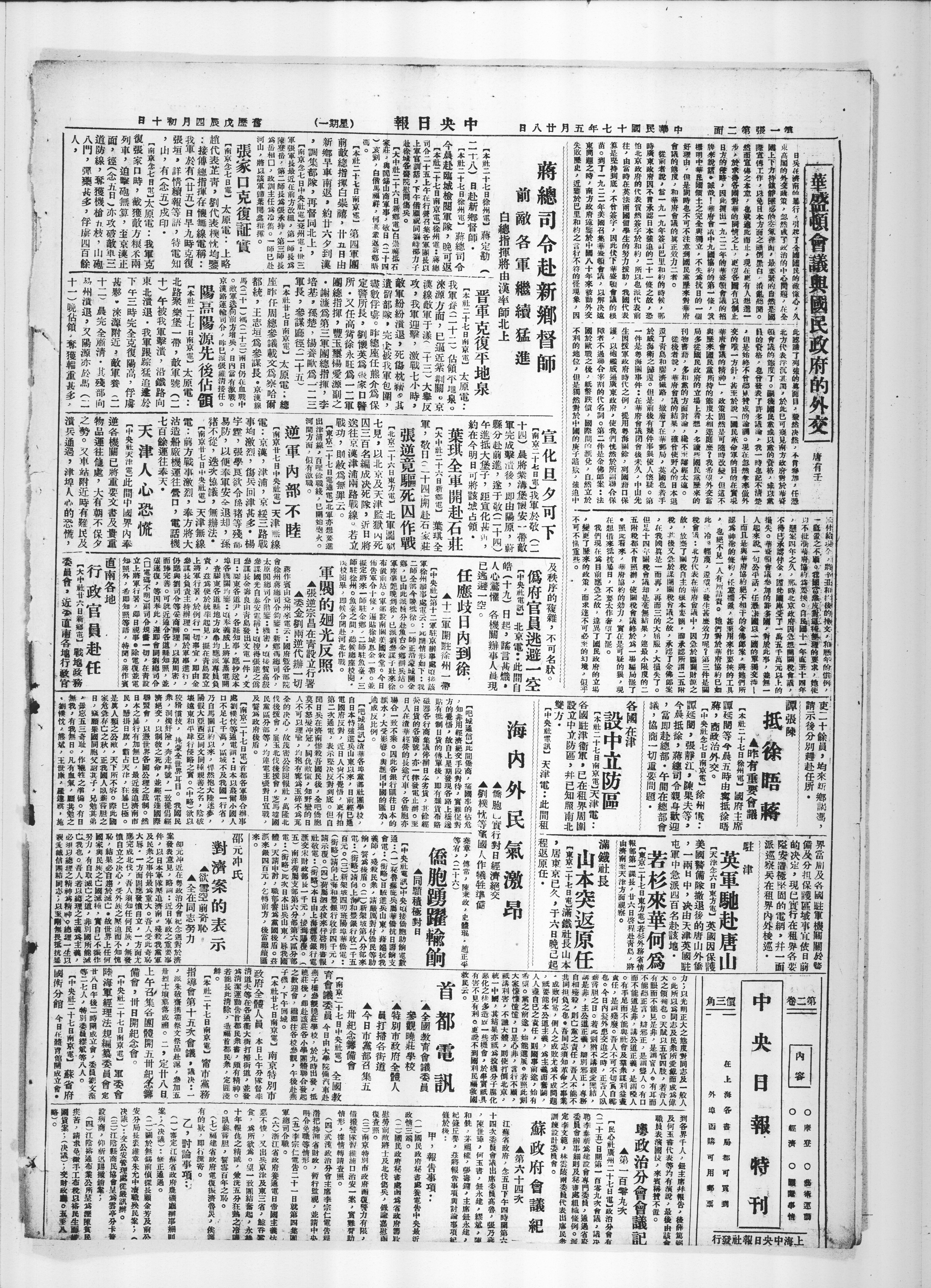 【中央社天津范】此间中国界内奉 逆各机关已将重要文书及贵重 物品运往他处,大有朝不保夕 之势。又车站附近时有难民及 没兵通过,津埠人的恐慌?