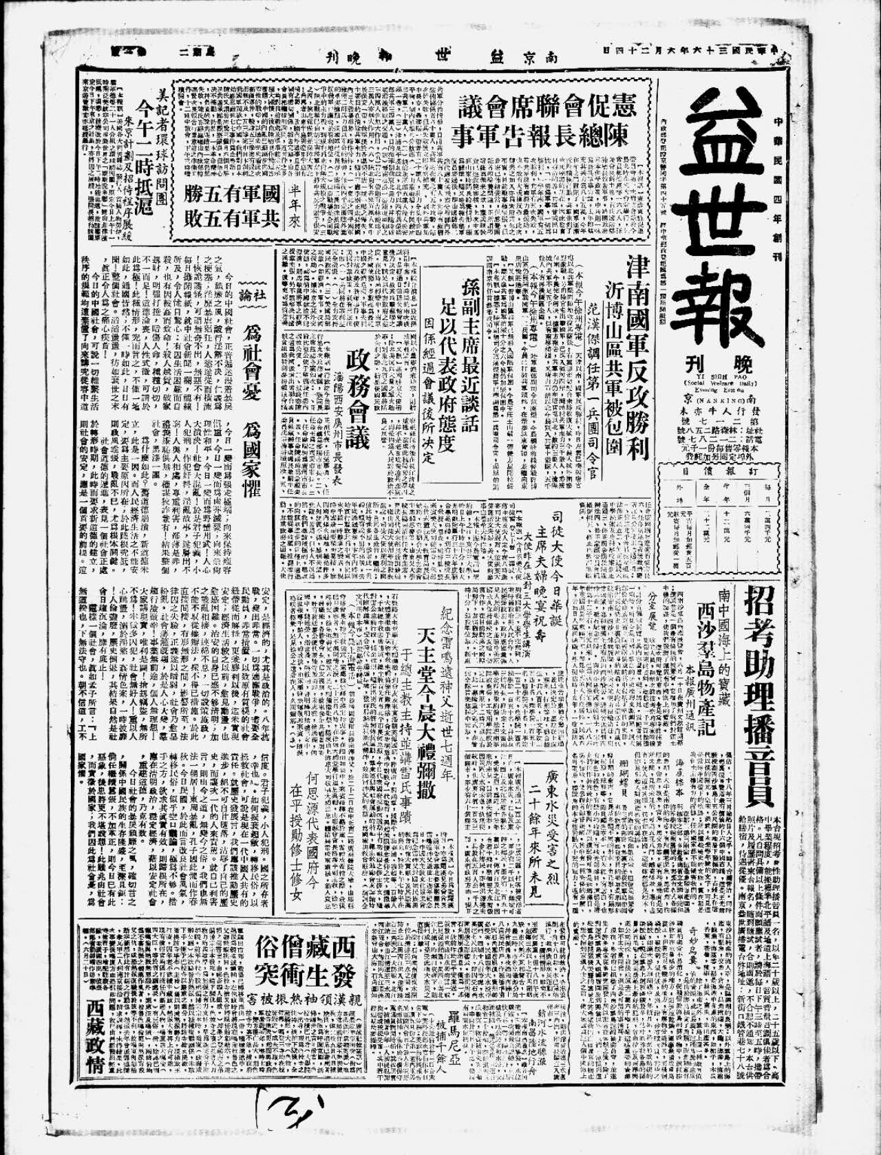 【本报讯】今日为美大使司徒雷 登七十晋一寿辰,蒋主席及夫人定今夜八时邀宴司徒大使祝寿,并邀英大使施谛文夫妇,美大使馆参事白德华夫妇作陪。 【本报上海今晨电话】圣约翰,之江,东吴三大学,昨日上午十时三十分,假大光明戏院举行三十六年度联合毕业典礼。 到有三校校长,教授,鄂森,姚启胤,暨来宾美大使司徒雷登,朱部凡,敎育局长顾合大学筹委会琇,华由东吴大学大会主席,长致训最勉使用华语发表大使以流利之国生致贺,继称;感触。 去年内将开中国有史以之机遇,现结,惟难免许多失望,不以为建设