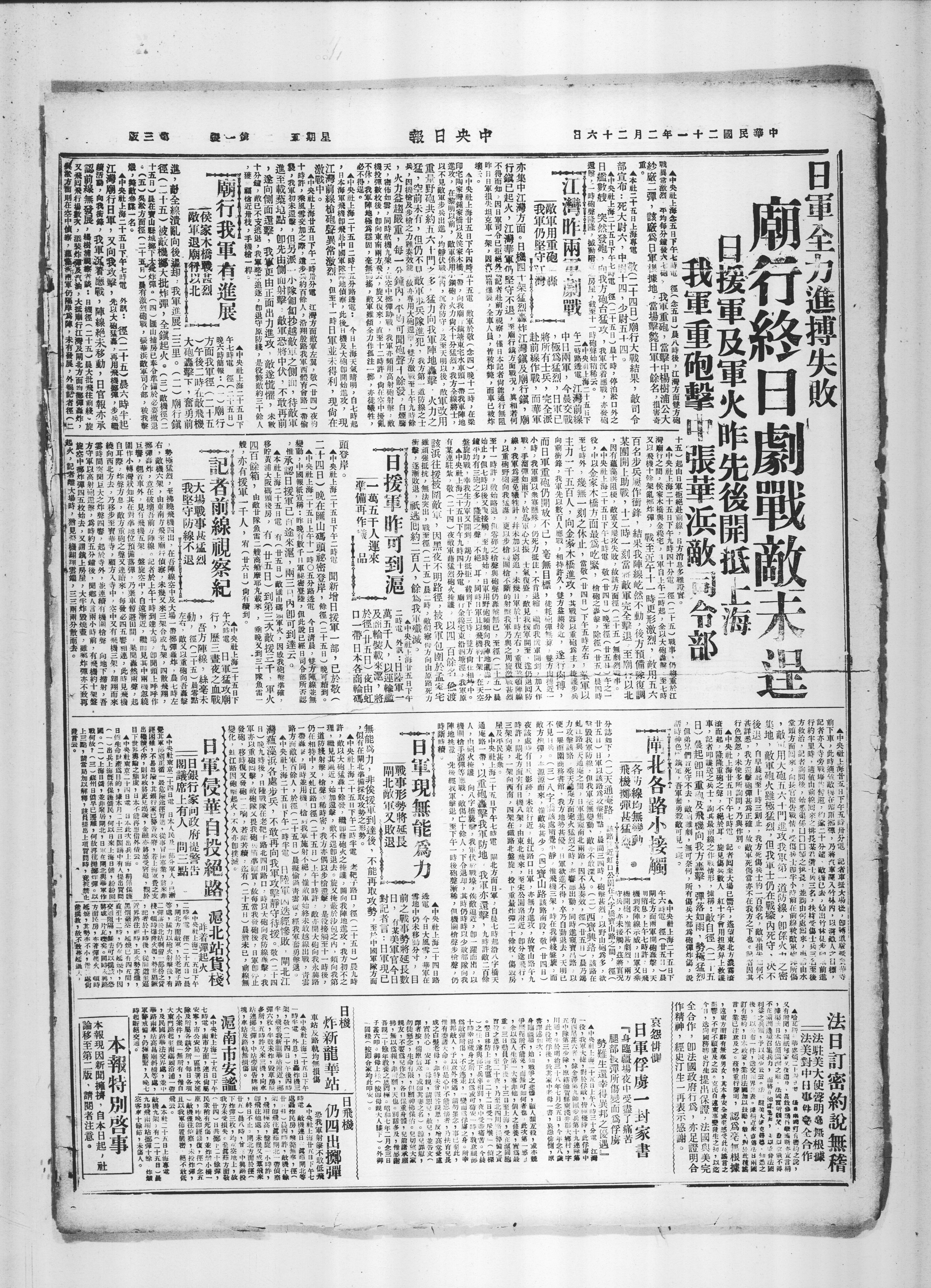 日军全力进搏失败 庙行终日剧战敌未逞