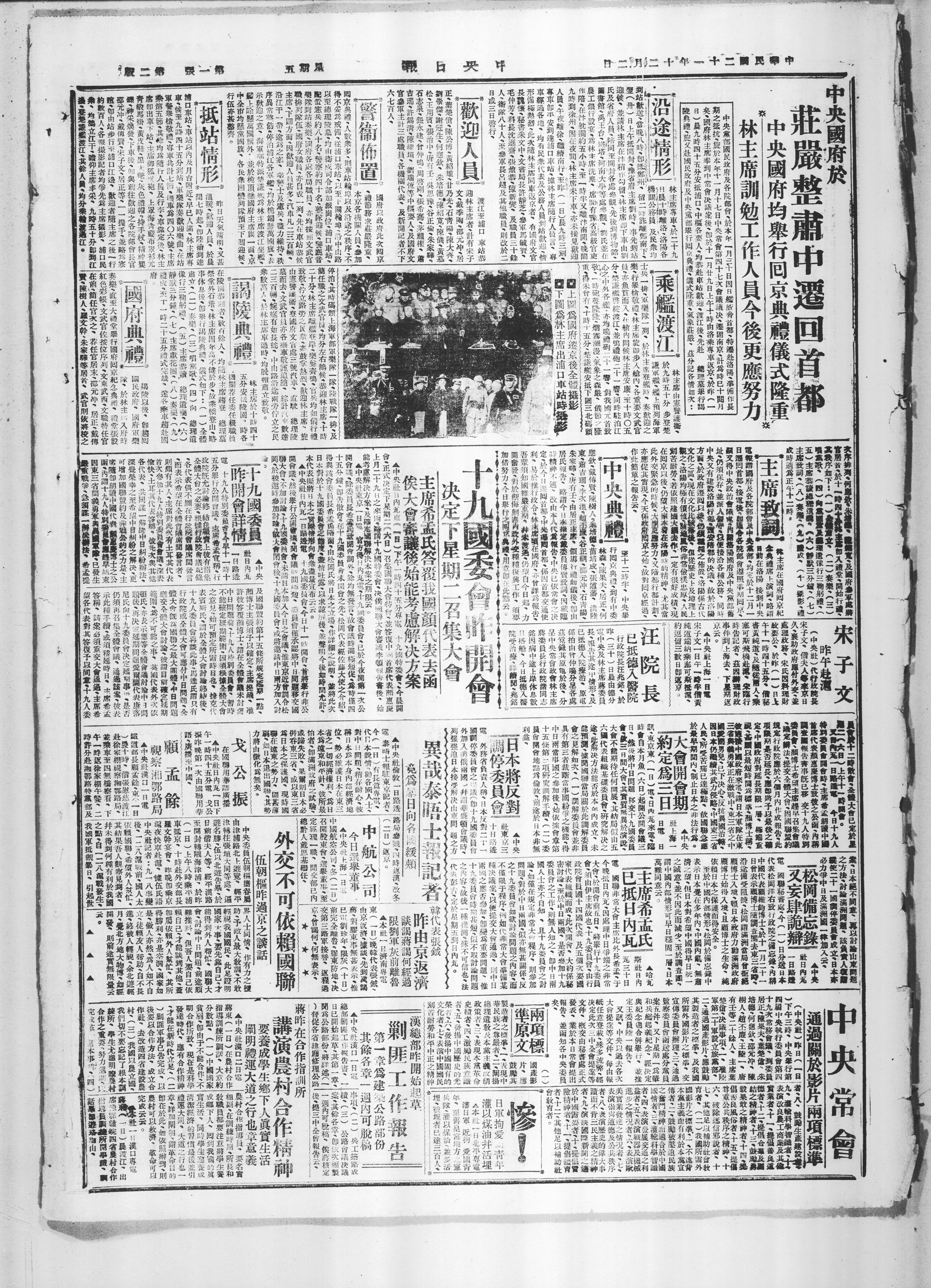 矣、国府林主席奉到中常会决议案後。即於十一月廿九日上午十时由洛乘枣车返京於昨(一