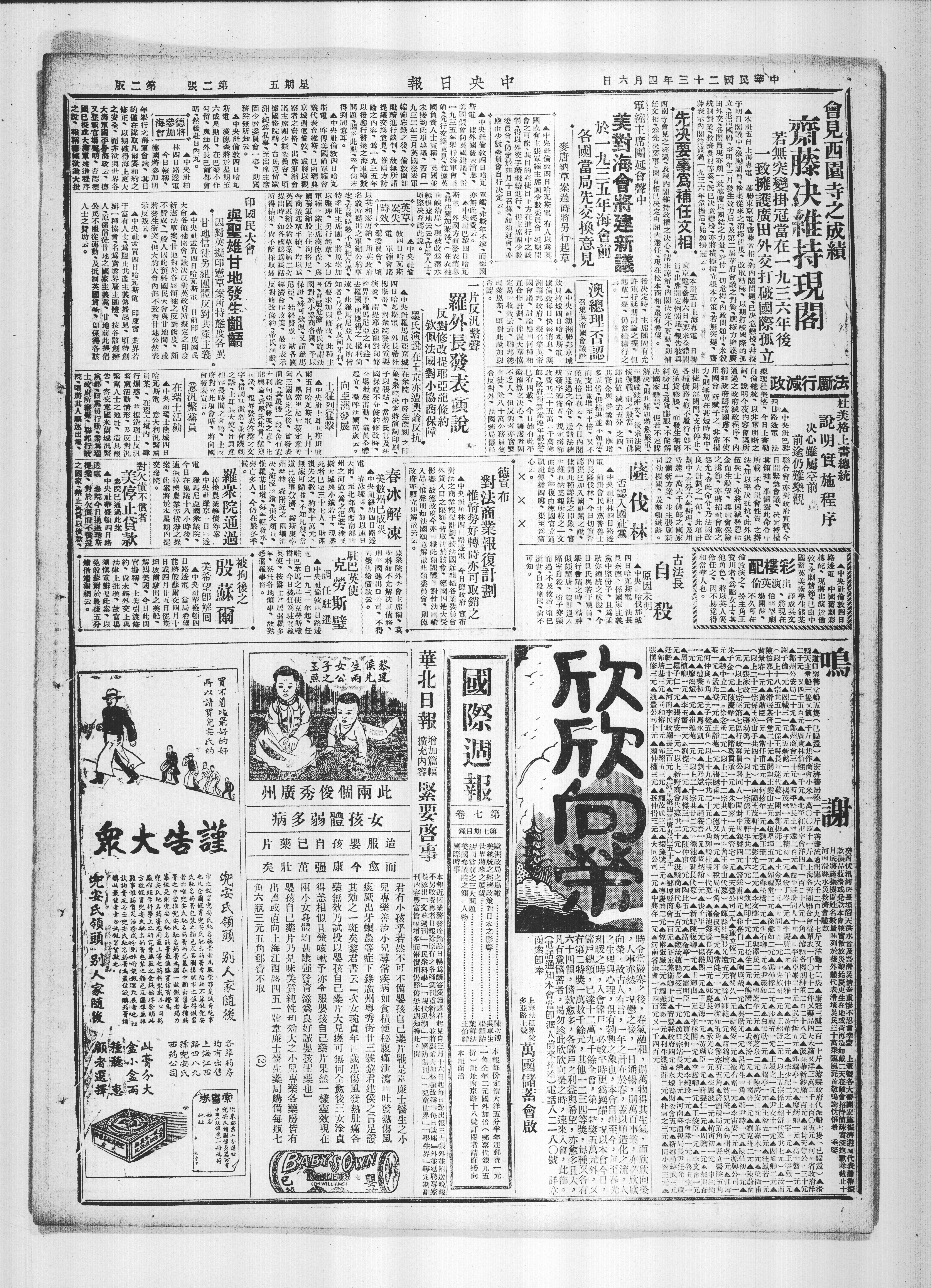 于明日阁议中激励阁员舍弃从来之消极态度改取积极,以期打破国际的孤