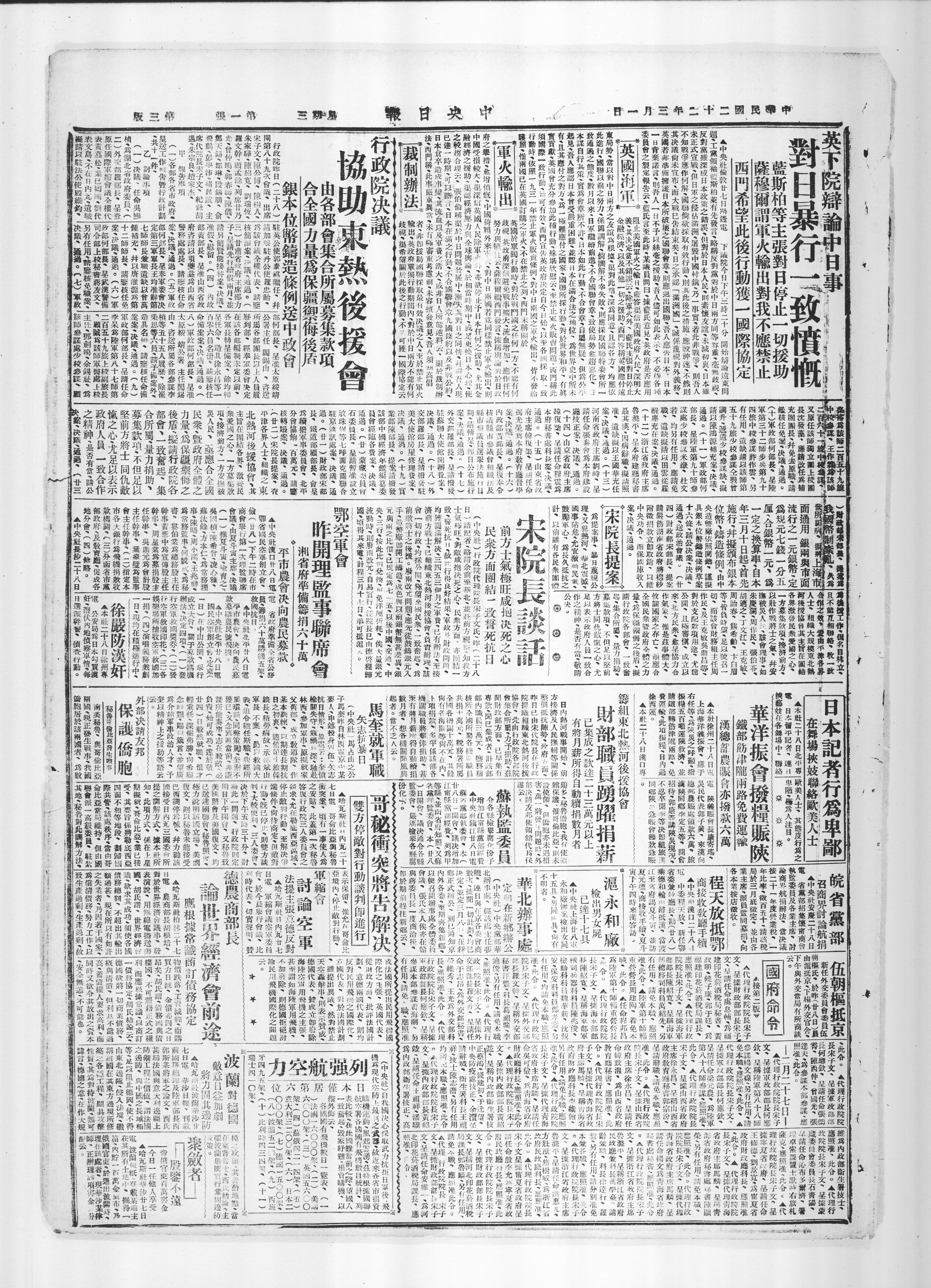 中央社报道,27日路透电下议院今日下午3时20分开始辩论远东问题工党领袖蓝斯柏莱有先发言、略称反对党对于中日两方同等尊重、毫无歧视、反对党虽深感日本政策之错误、但对于日本人民、则素怀友谊、未减初衷、日本虽未正式宣战、但日军之侵占满洲、屠毁中国村镔、乃一事实、若此非战争、则吾人不知战争应作何解、国联倘欲采取有效行动、则其此后之措施、 应较神速《不然则其决议尚未宣布、而大战巳告结束矣、日之承认「满洲国」、诚系蔑视对外义务、英国若非凖备拥护日本所破坏之国联会章、则应退出国联、吾人应告日本,日本一日背弃诺言、则吾人一日不予以丝毫之援助、吾人尽可如此表示、不必待各种委员会之制定报告云、蓝氏言至此时、某议员问曰、据蓝氏意见、英政府是否应用