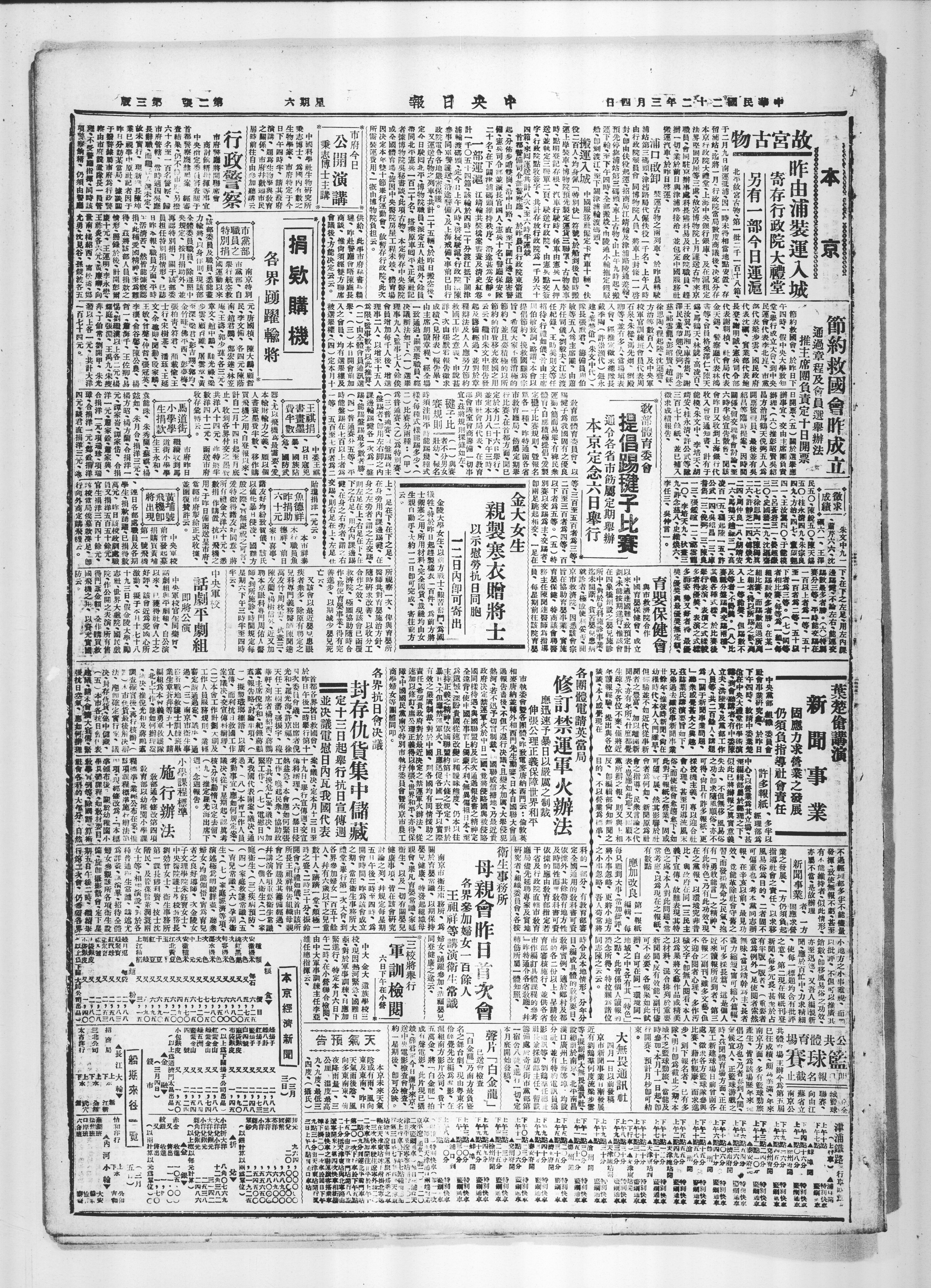中央军校官生同乐曾、话剧组与平剧组、自公演以来、已获得社会人士之好评、该会近为爱国心所激动、拟于卒月十七十八十九三日、假金陵大学、励志社、世界大戏院、国民戏院、作公开之表演·所有售得门票金额、全作购买救国飞机之用、以资允实国防云