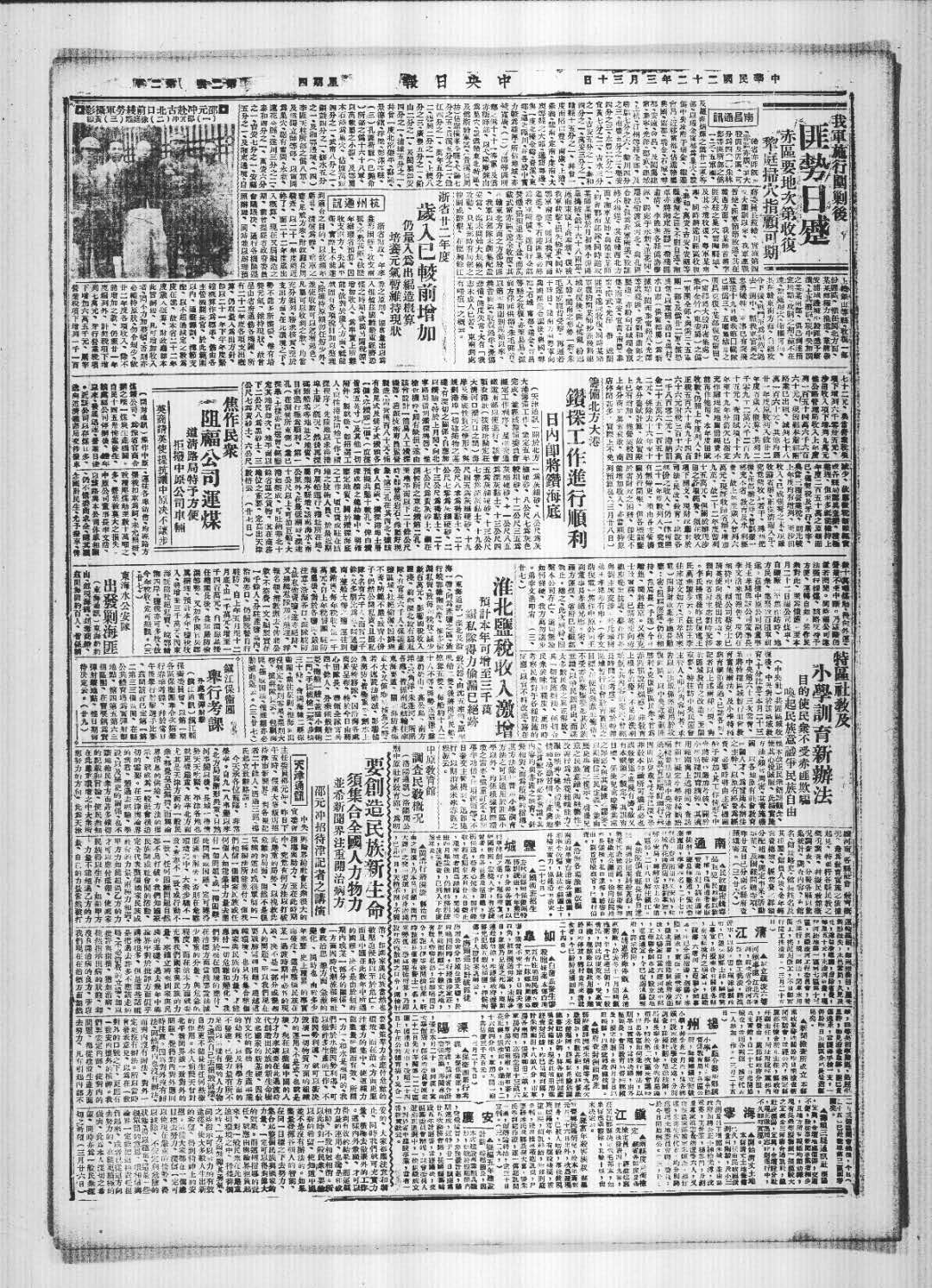 乐锐武器、由沈五率领、原帆船二双、后将附近民船掠夺五只、每船约十人二十人不等、匪势逐猖獗盘据奶奶山、高公岛、南方洋、三角洋 朱蓬河、所据各处、皆系南北航输往来东海要道、关时海防亦 极重大、又值春捕鱼之时若不速设法勦灭、影响捕鱼海防、皆极重刻水上公安特务队、因沿海各处商民呈报、特于今日由蒋心田欧长、带领全队官兵四十余人、分乘铁殻船二双、 炮船一艘、并携小钢炮二门、手提机枪二架、步三十余、会同海赣二县保衞刚、前往聚剿、惟海田没无定、散则零星、聚则大帮、据蒋队长云一包则海匪极感困难、惟虽难亦必勦灭而返云云。 (三、廿七二)(东海通讯一淮北及沿海一带、向为产堕之区、销行皖鄂赣湘四岸、惟多偷漏私卖、致每年税收、减少数百万元、影响国税收入匪浅、前年淮北设有缉私队、有官兵六千人、保护产盐区城、杜绝偷漏、因辨理不善、防范不严/致宵小份子、仍然公开私卖、且缉私队、名有六千人、而实二千余、又多朋比为私暗通盐商·整船大帮之盐运往别处销售、每年税收、运一千万元、 自上年税警团驻防海属后、对于各盐颐、严加注意、沿海各口、派队驻防故私偷卖盐、遂亦绝迹、又将缉私队加以整理、浮报名额、扫数删去、俾将公款不空费一文、编制实存一千余人、分驻产盐内、沿海要口、仍归税警自行