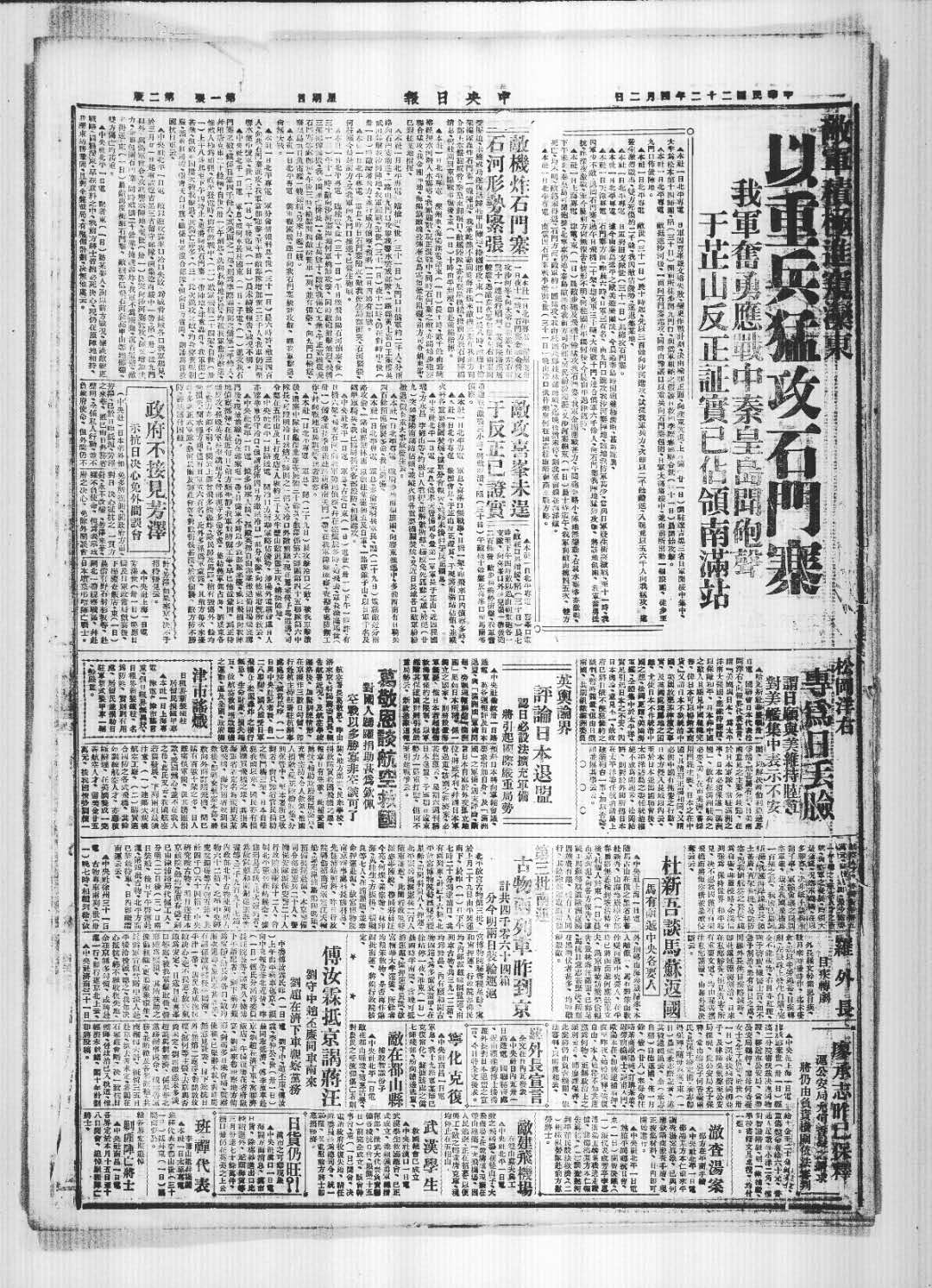 中央社报道,芳泽世(31日)晚应日侨及日军政当局欢宴后、下杨礼查饭店·东(一日)晨偕有野石射杉坂等、赴北一带视察战区、井赴日本坟墓吊唁阵亡战士。