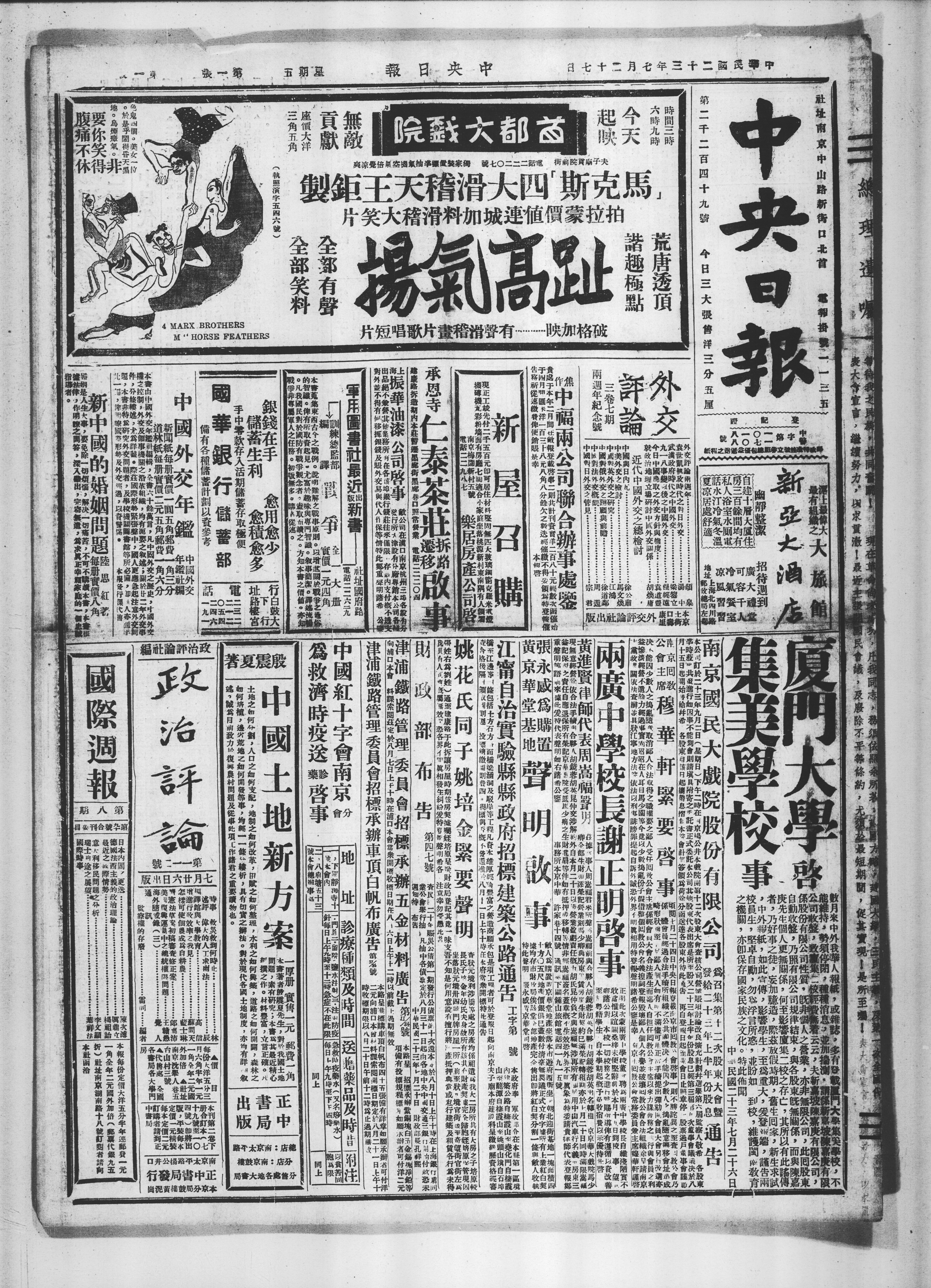 時間三時六時九時 今天起映 首都大戲院 無敵貢獻 座價大洋三角五角 夫子廟貢院前街 電話二二二〇七號 獨家裝置標準抽氣機空氣倍覺涼爽 拍拉蒙價值連城加料滑稽大笑片 荒唐透頂 諧趣極點 趾高氣揚 全部有聲 全部笑料 破格加映…………有聲滑稽畫片歌唱短片(執照演字五四六號)
