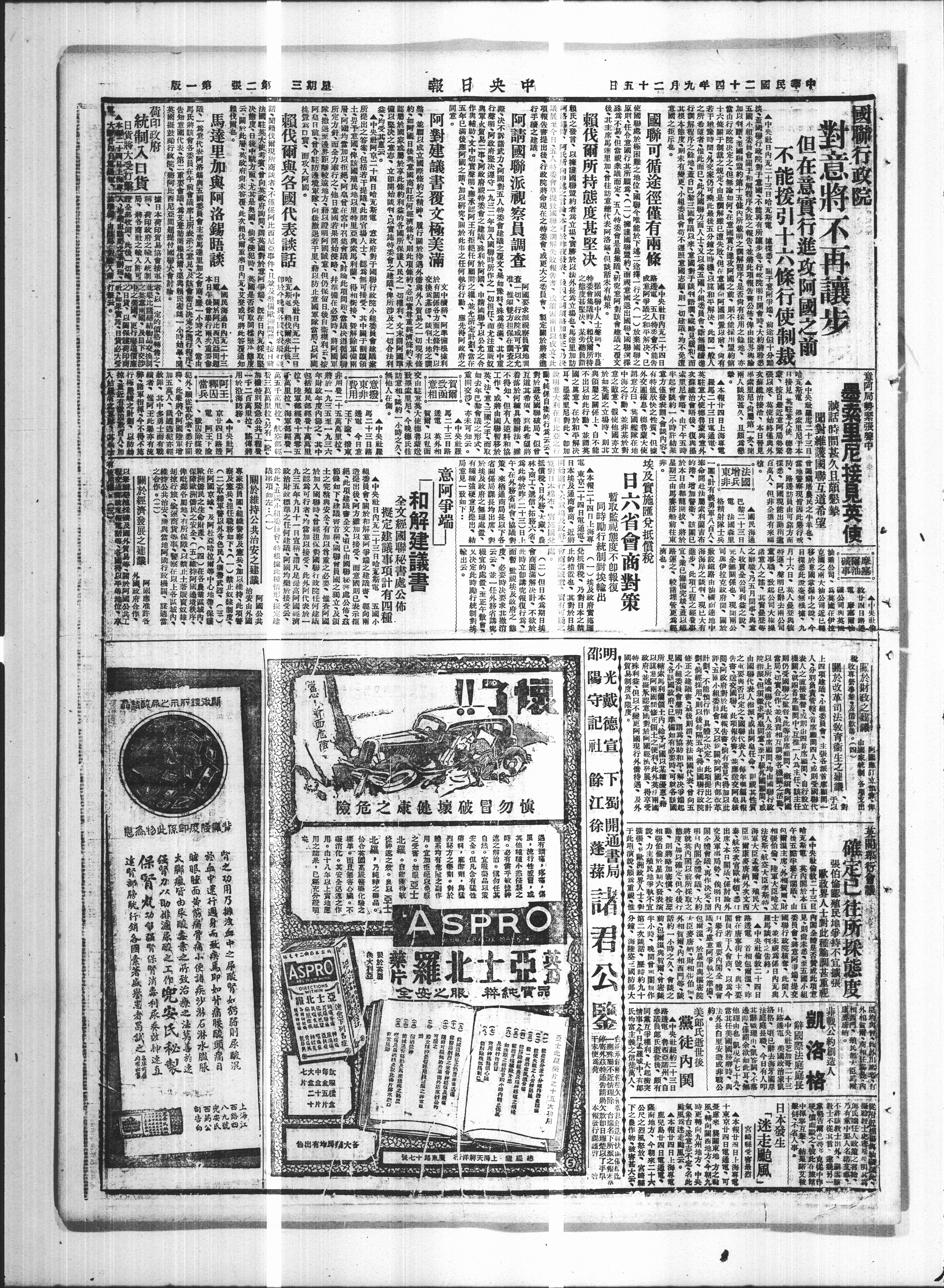 國凝鼓行政院將何比西尼亚周题提付國聯大會。