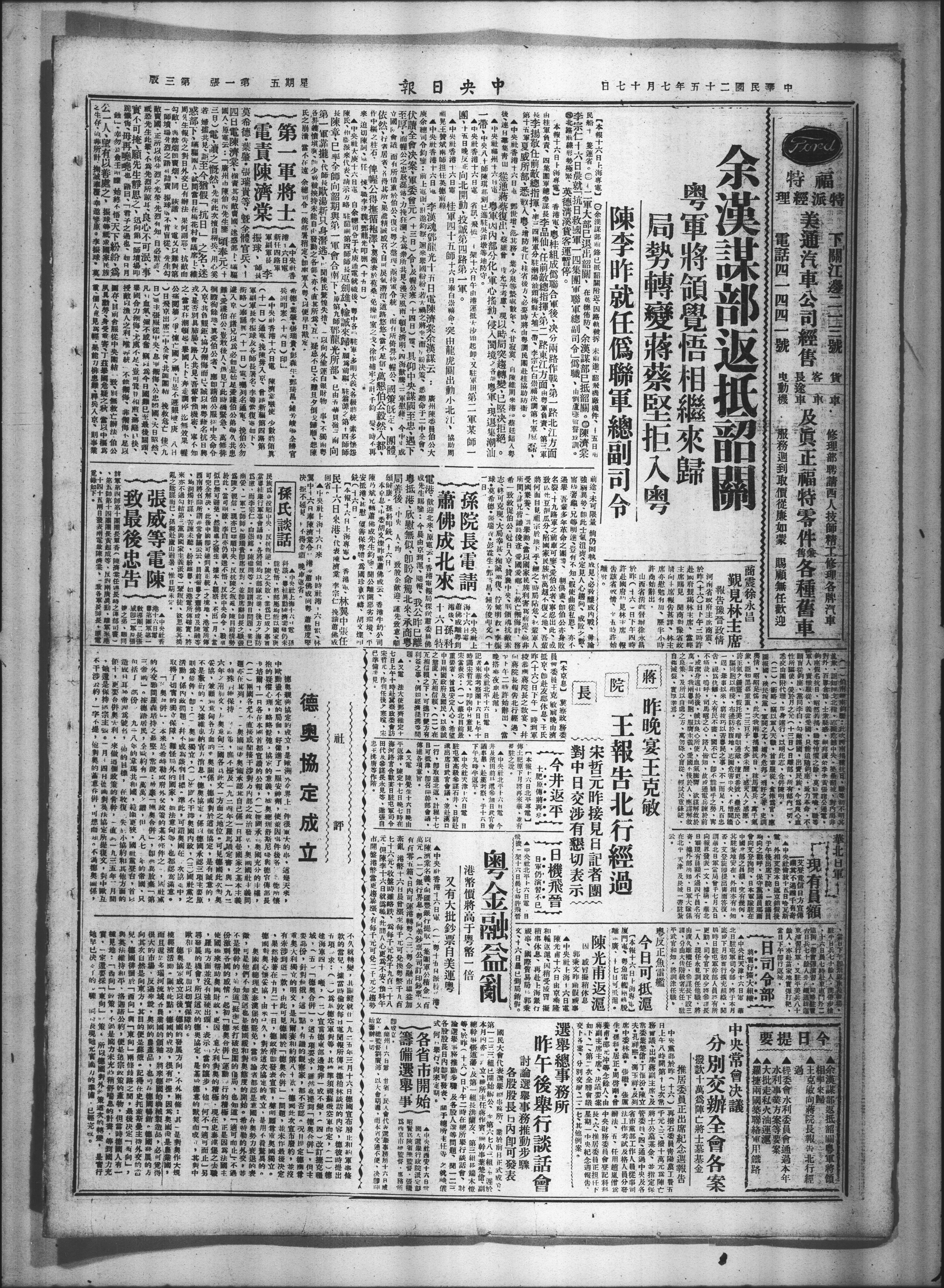 中央耐香港十六日粤十五日派员港