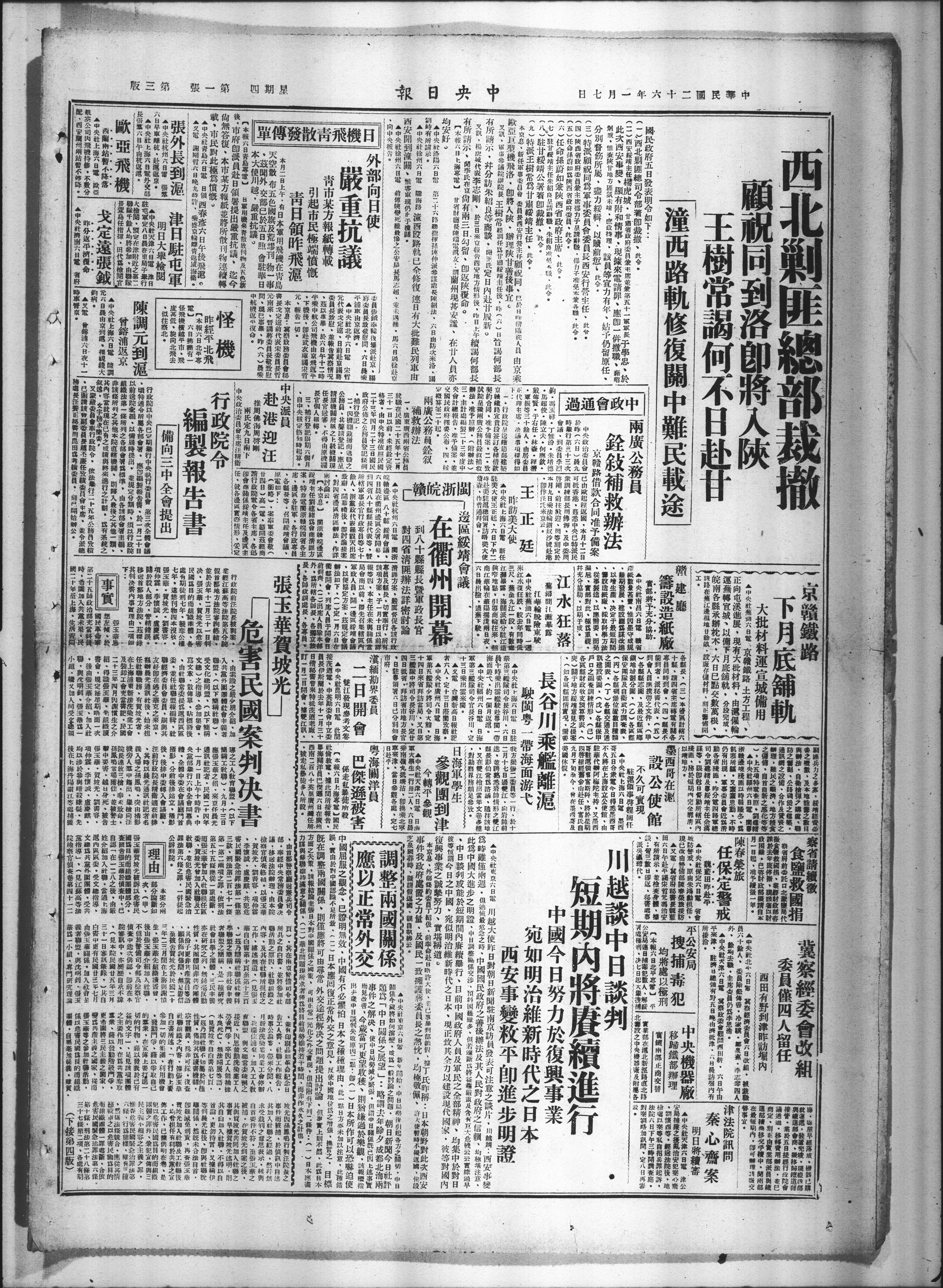●中央社东京六日川越大使昨日对朝日新闻驻南京访员发表可注意之谈片川越请:西安事变