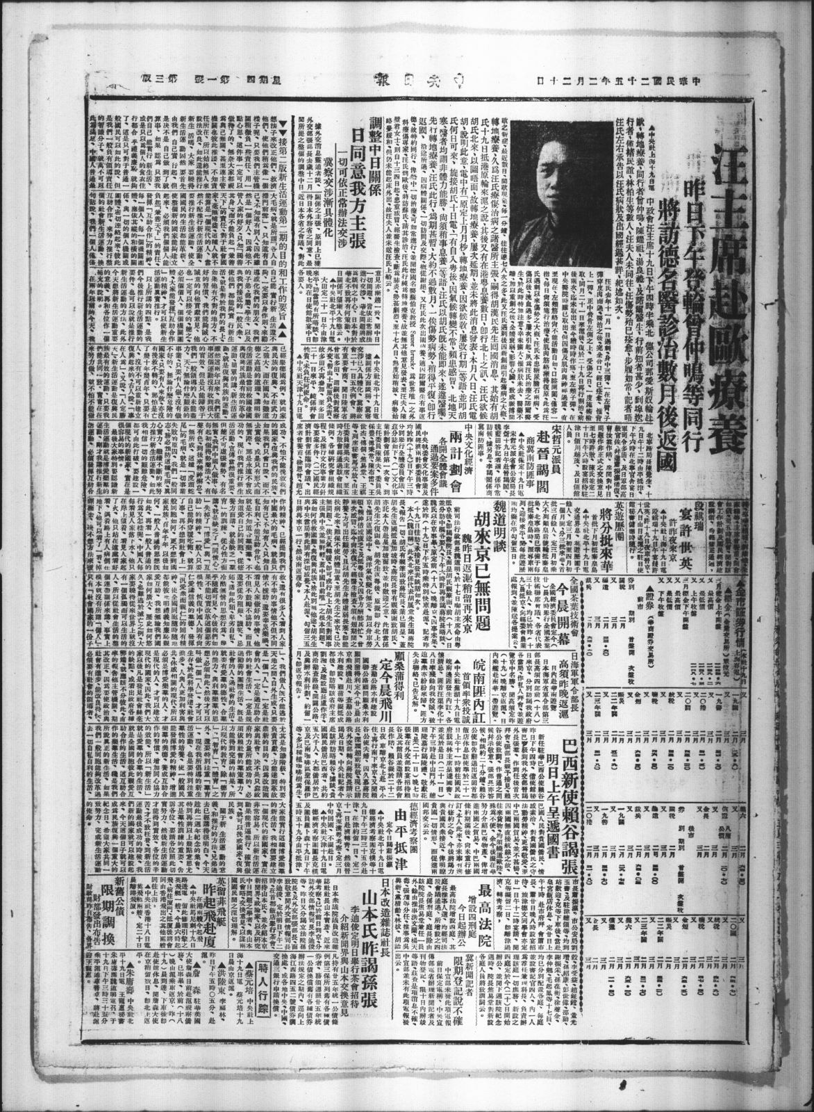 ▲中央此上海十九日中政會汪主席十九日下午国時半乘北德公司那爱新双输