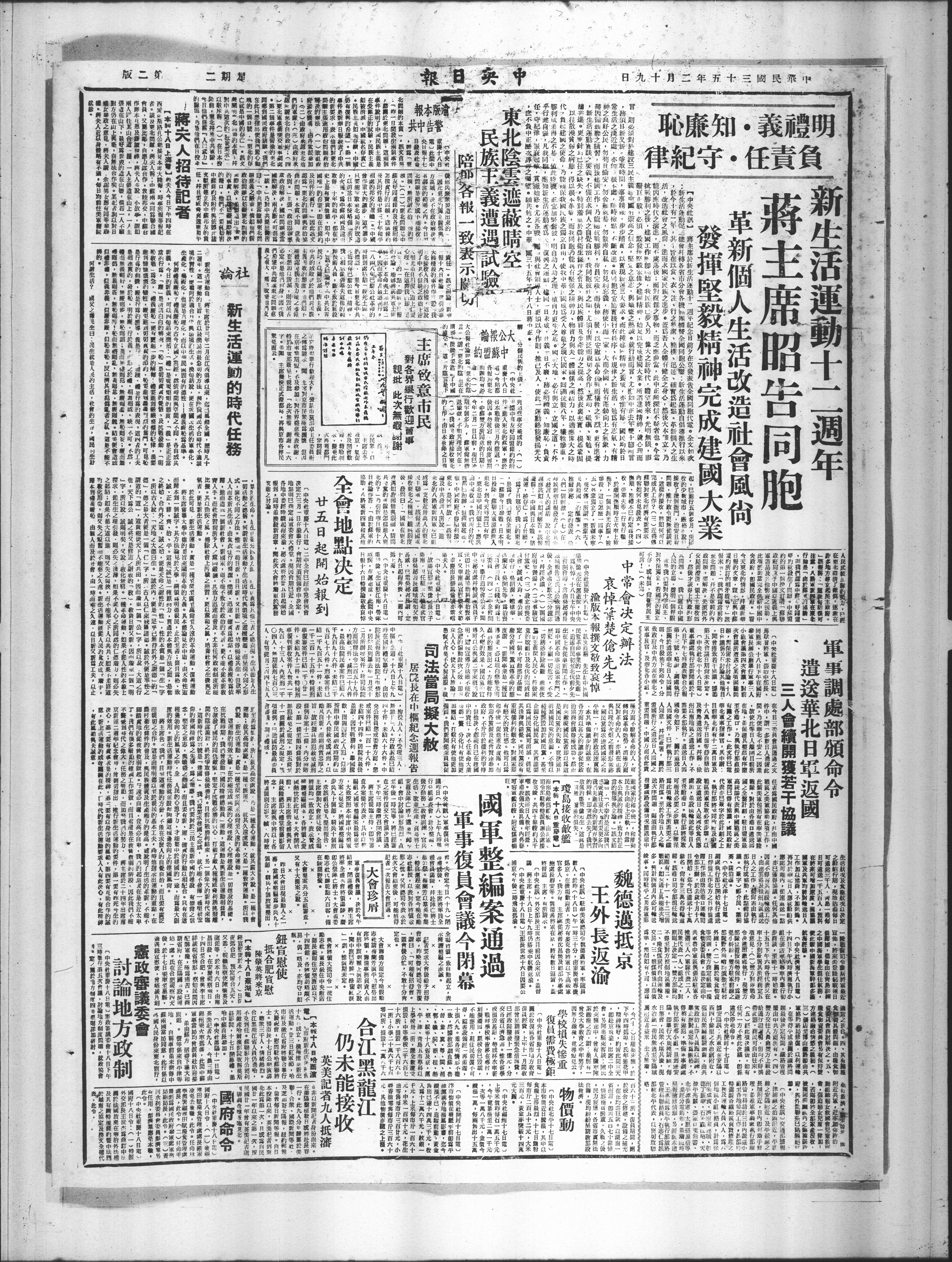 【中央此重隐十八日电〕葱政蓄议委鲁十八日下午