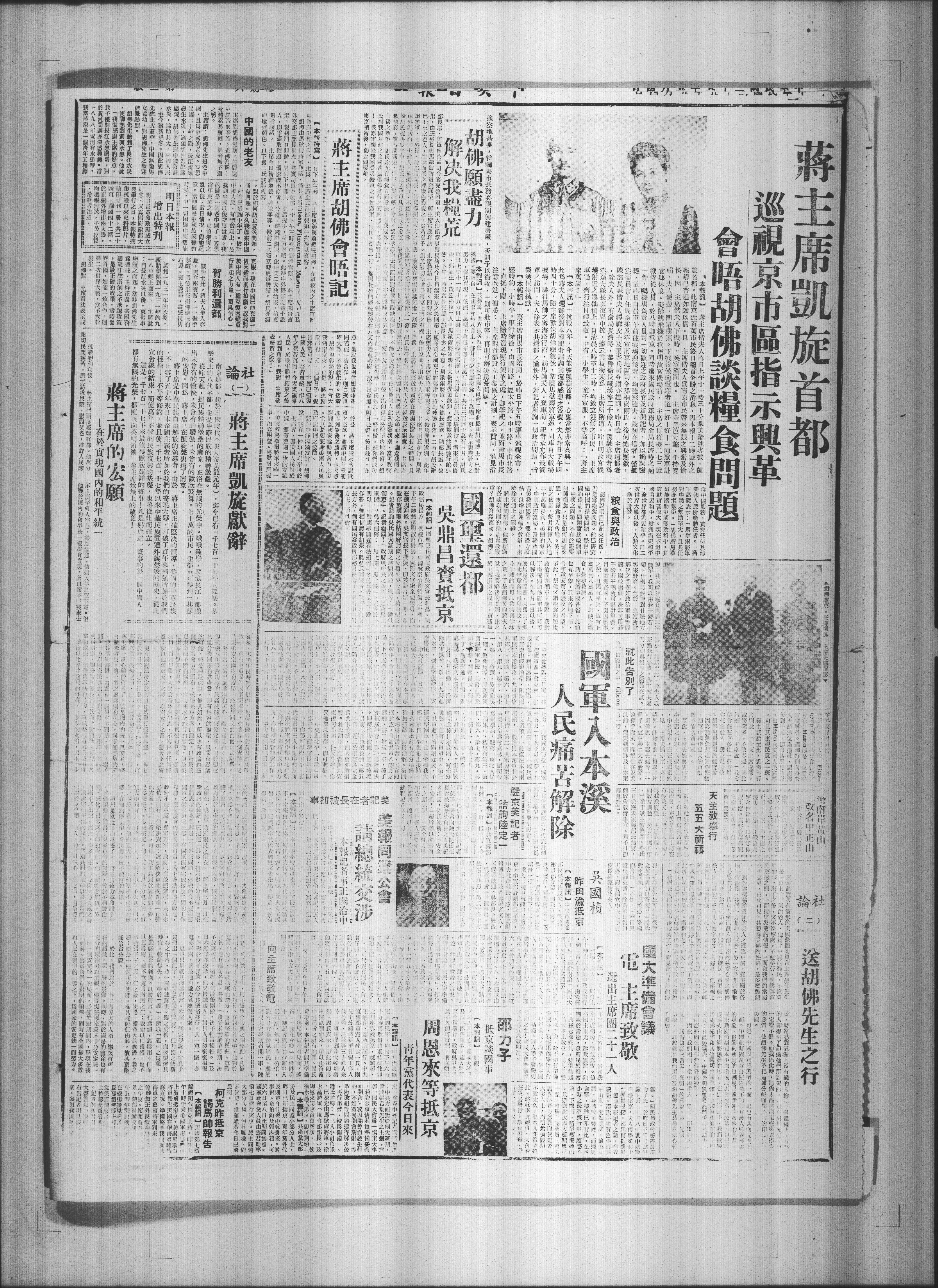 蒋主席凯旋首都 巡视京市区指示兴革 会晤胡佛谈粮食问题
