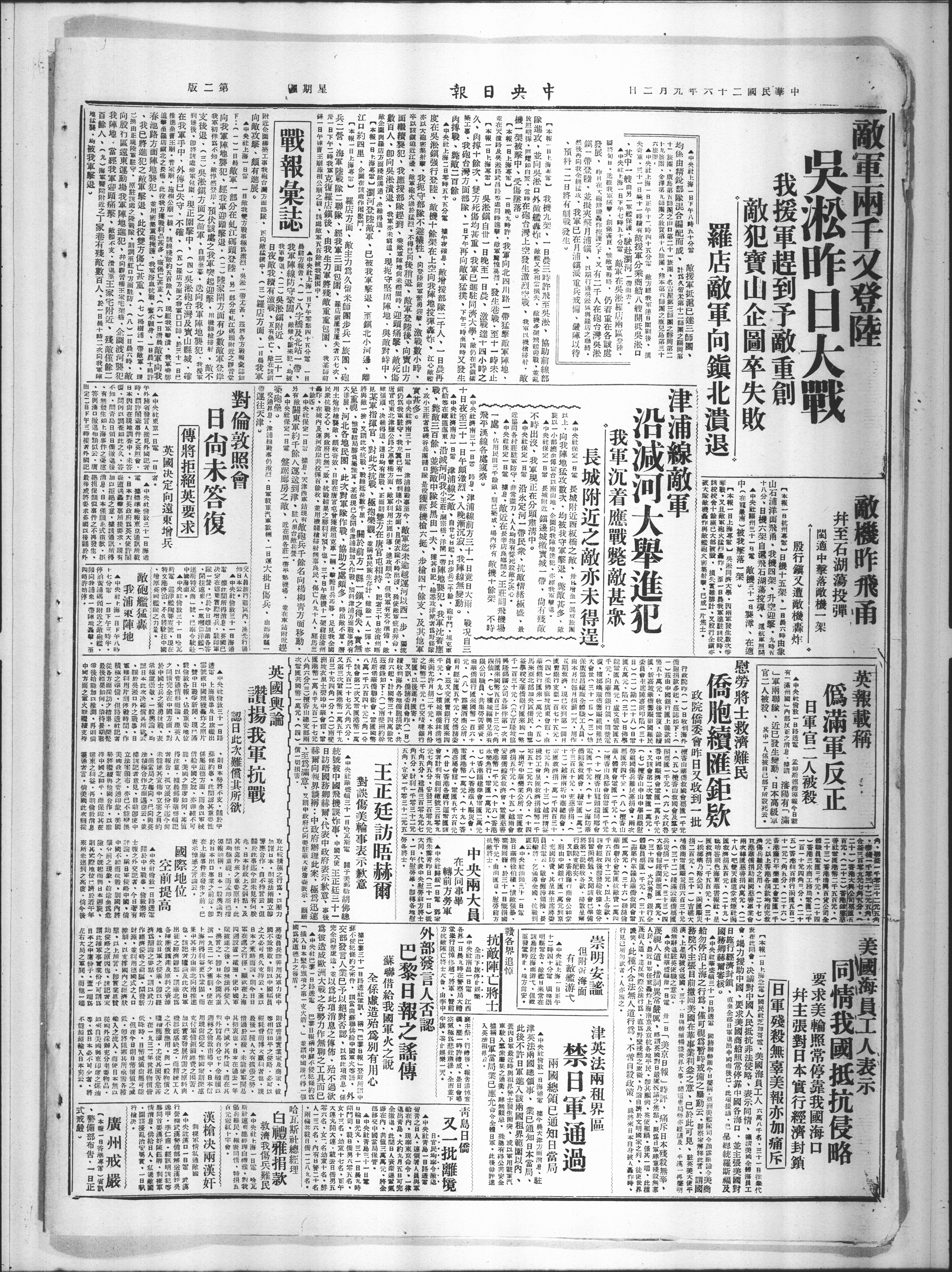 一日晚九时许·我军向北四川路一带猛繁蔽军阵地.
