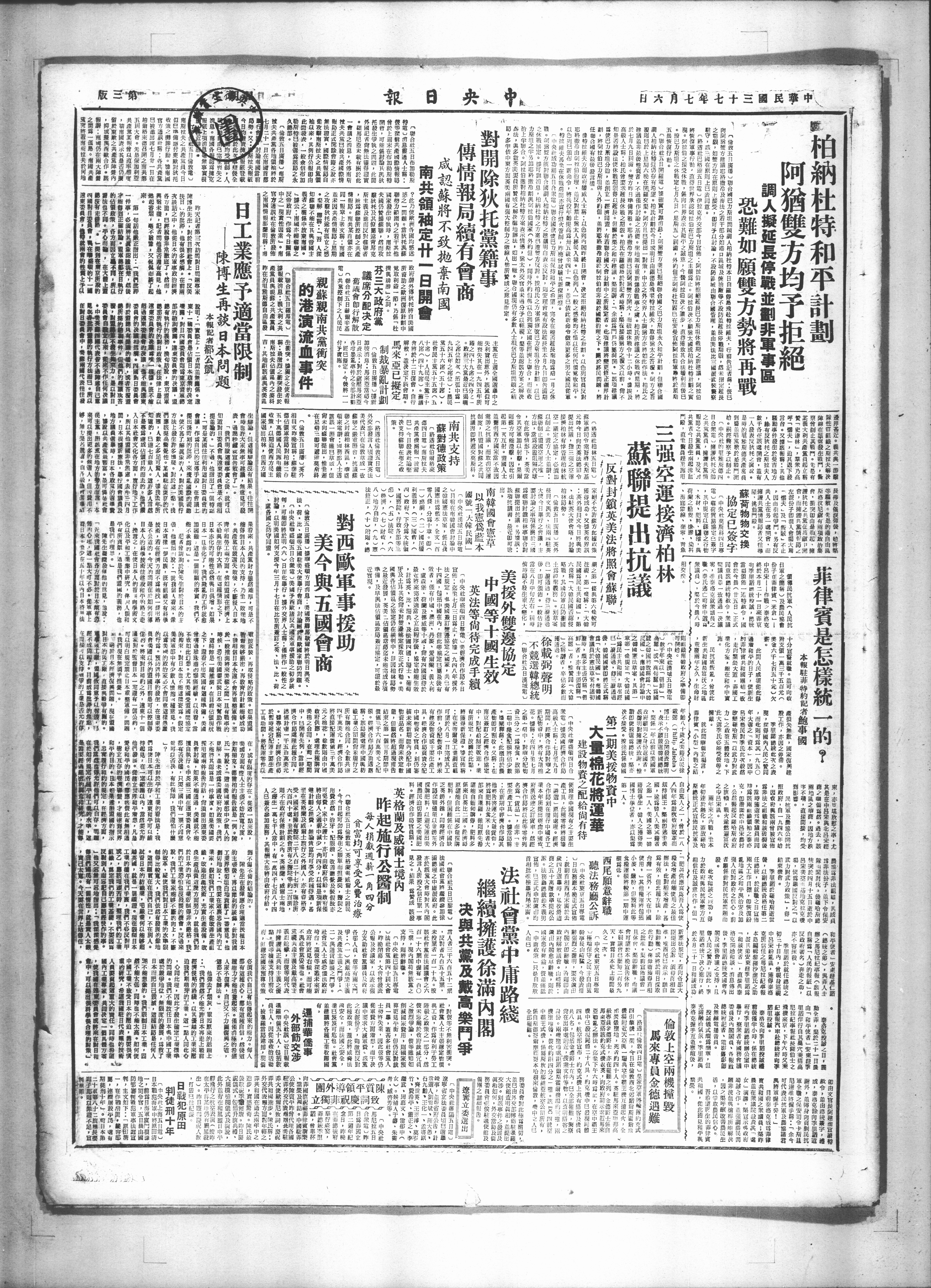 之期限,如变方均在原则上接受,即可子以讨论,不设防区城由联合国管理,并由美法比三国派武装警察