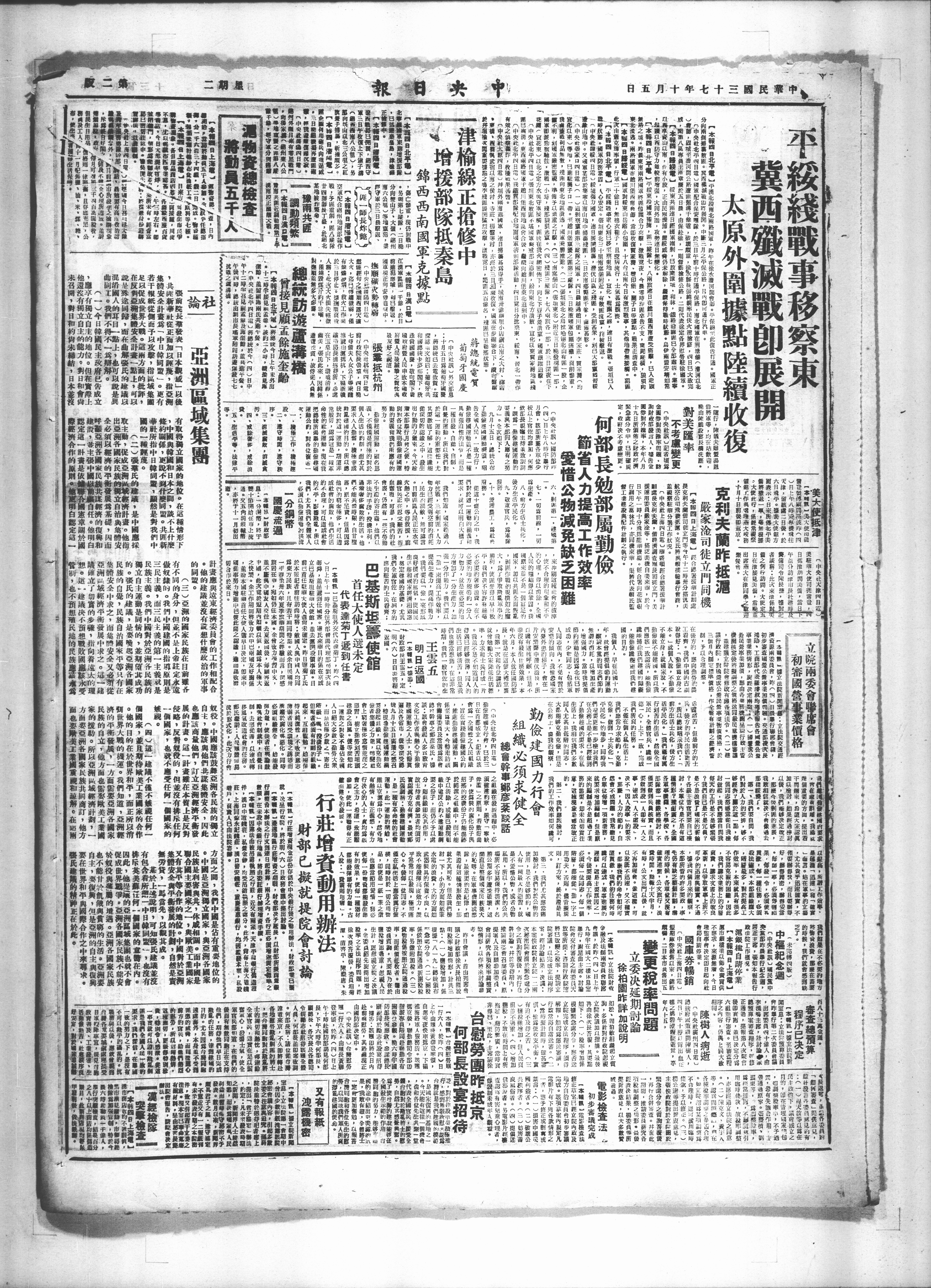 中央社北平四日蒋统於今(四)日中