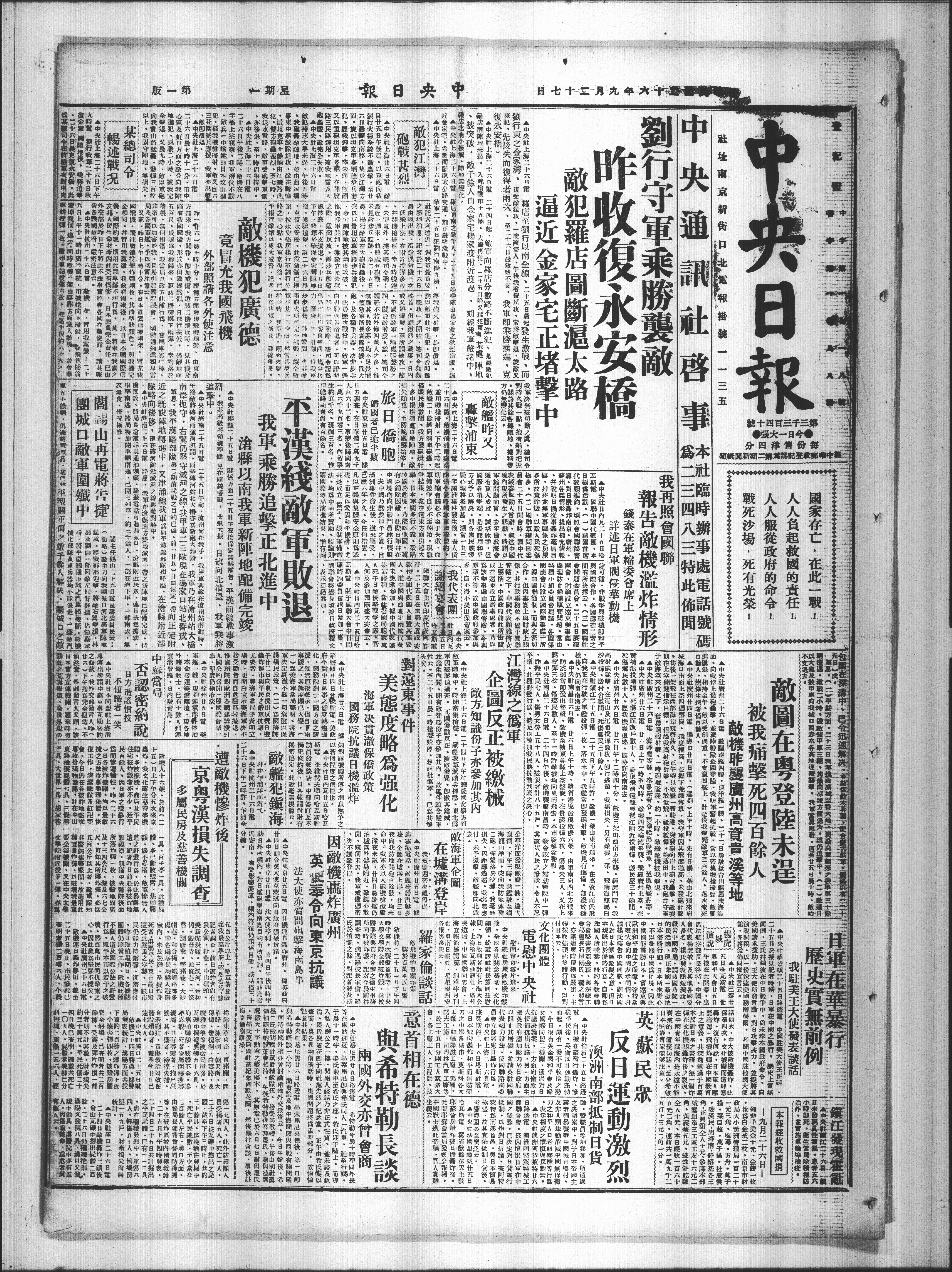 | 文章题名: | 我再照会国联 报告敌机滥炸情形 |