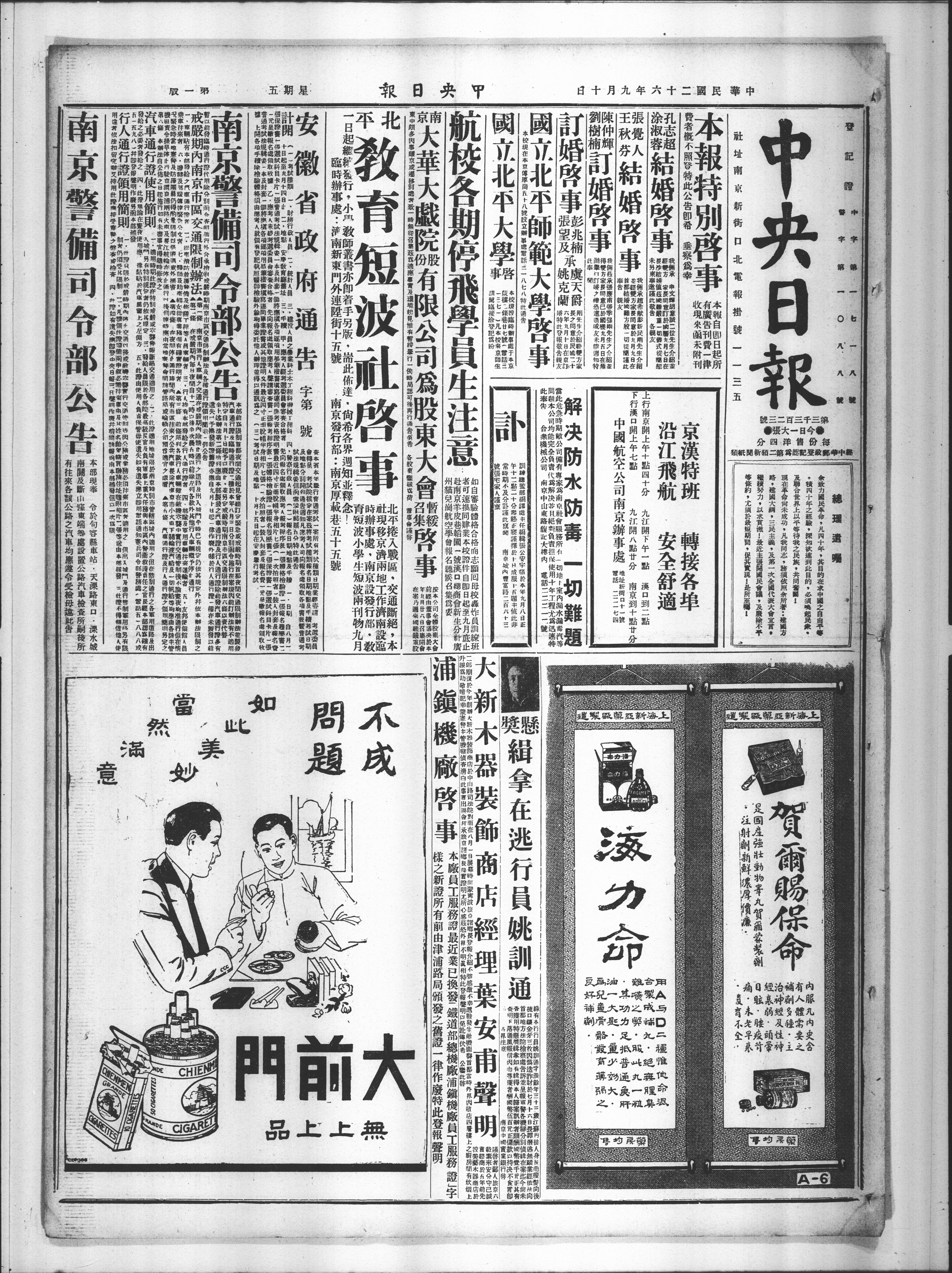 谨启者鄙人旅京六载素来安分守己诚实经商于五年前设美术木器商店于二郎庙复于今年创办大新木器装饰商店于中山路司法院对面在八月一日展幕时尚蒙宁波